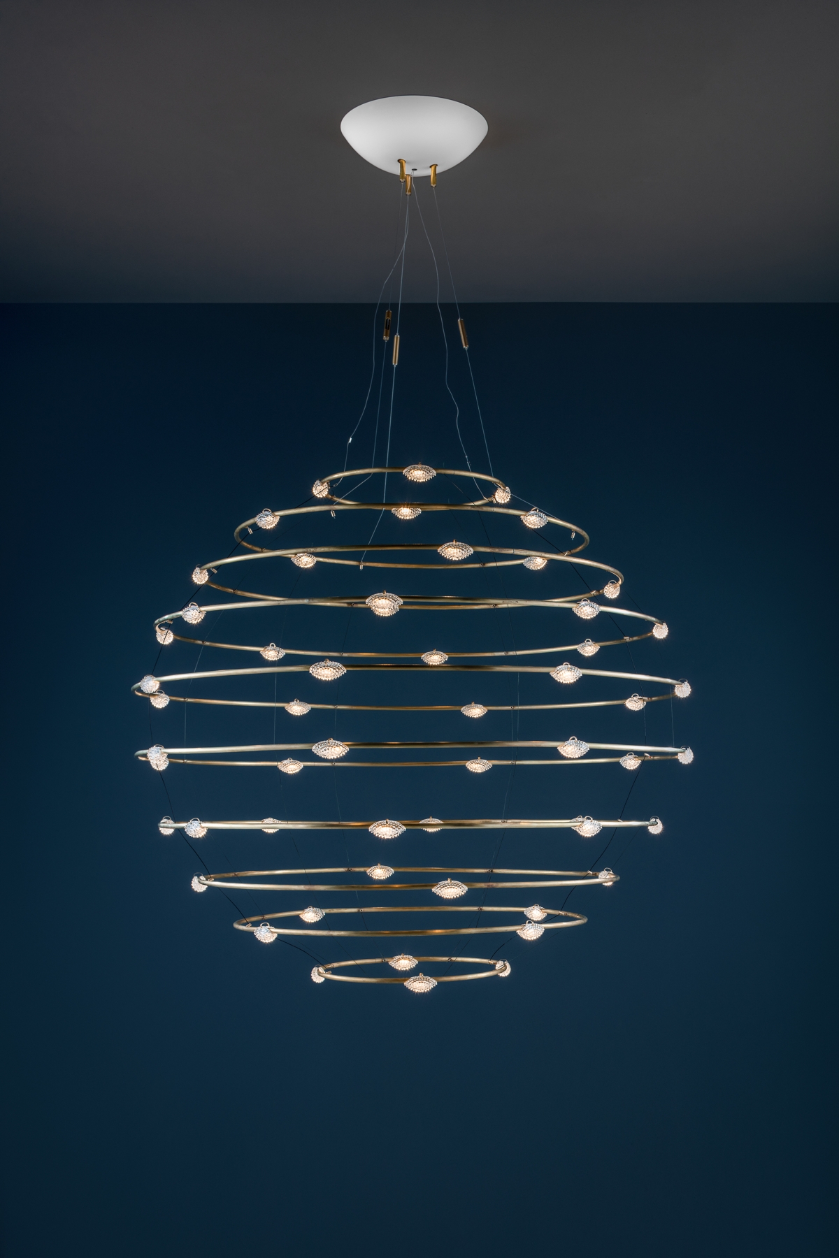 La struttura di 56 Petits Bijoux si compone di una serie di cerchi, ora più piccoli, ora più ampi, sorretti l’uno con l’altro da sottili cavi, che si susseguono fino a formare una sfera leggera da 120 cm, quasi destrutturata. Lenti ‘pochette’ in silicio ricoprono 56 LED per un totale di 6720 lumen – che assicurano un’altissima efficienza luminosa – tempestando di luce i cerchi in ottone naturale, come corpi celesti che seguono la propria orbita.