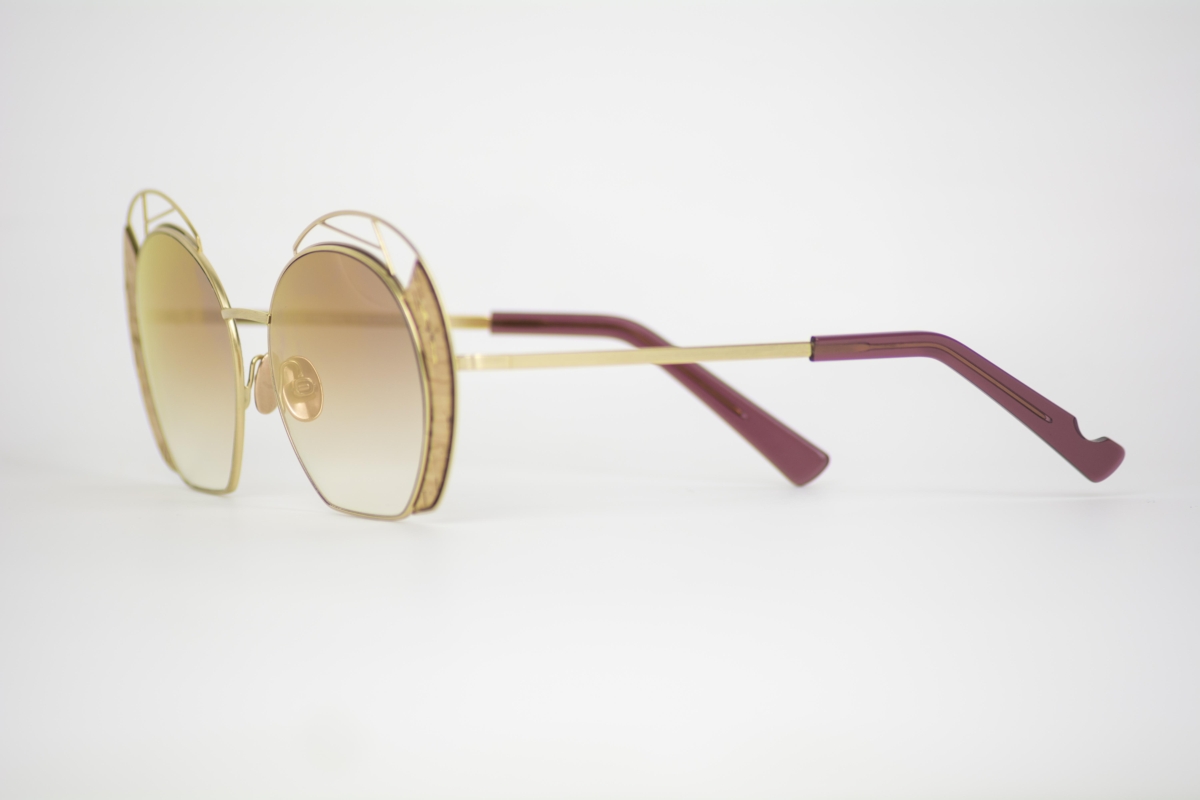 Il frontale rotondo, viene reso dinamico da un gioco di vuoti e pieni dati da volute decorative di acciaio, integrate magistralmente a inserti in sughero e foglia oro. I terminali sono in acetato viola per adattarsi perfettamente a qualsiasi viso.