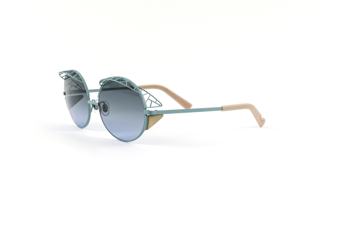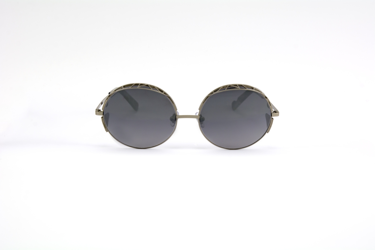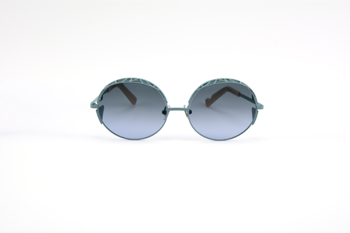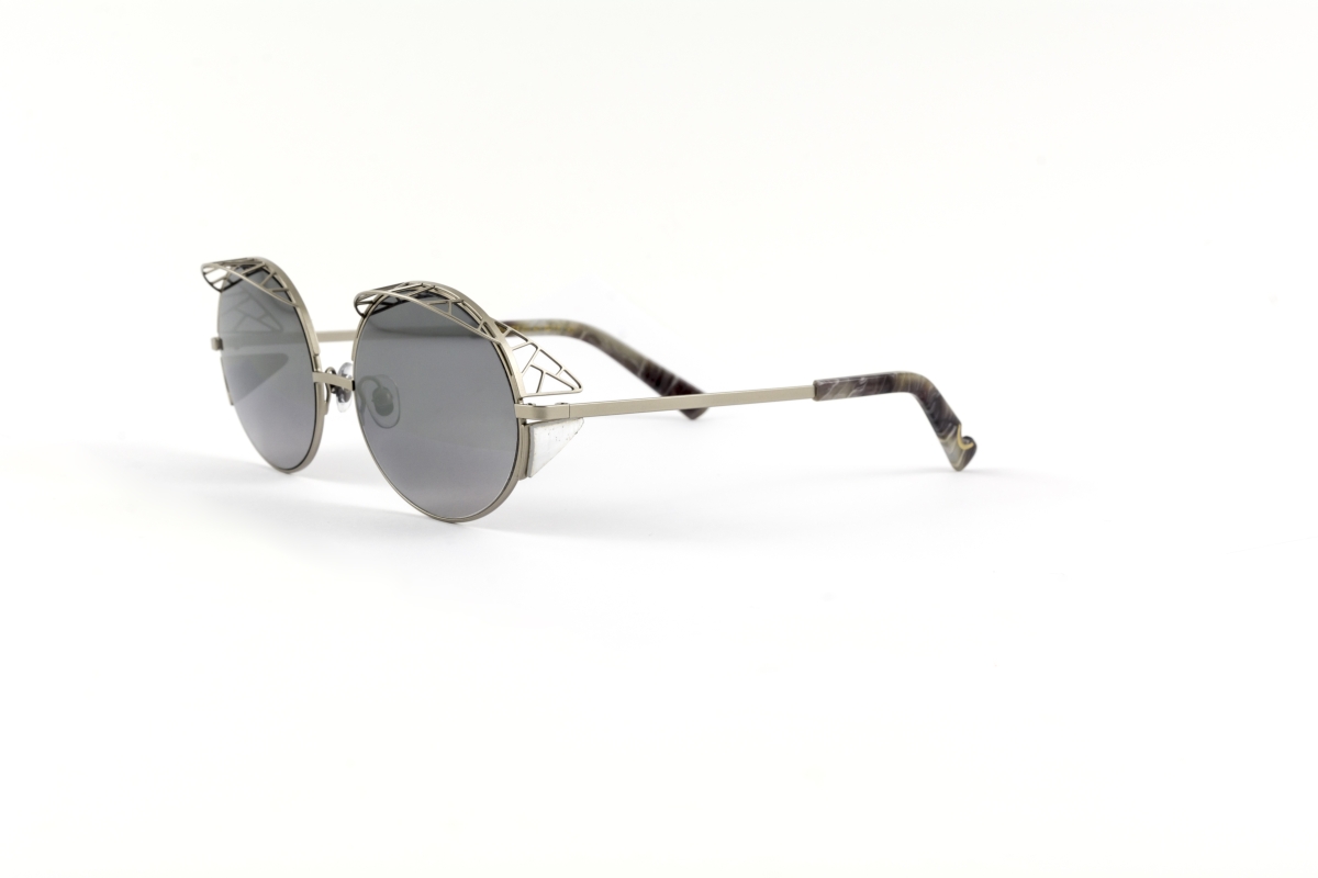 Una montatura in cui lenti Zeiss trattate con antiriflesso blu, sono incastonate in una struttura metallica che ricorda lo stile amato da Eileen Gray, in cui l’acciaio troneggia. Un materiale robusto e stabile, ma allo stesso tempo estremamente malleabile, in grado di modellarsi dando vita a virtuosismi materici. Il cigliare inconsueto di questo modello è composto da una parte superiore sporgente in acciaio, in cui ritroviamo il gioco di pieni e vuoti. In maniera speculare, tale sporgenza si riflette anche internamente, dando vita a un modello con paraocchi che riporta alla mente gli aviator, così lineare se guardato frontalmente, ma così complesso se ammirato lateralmente.