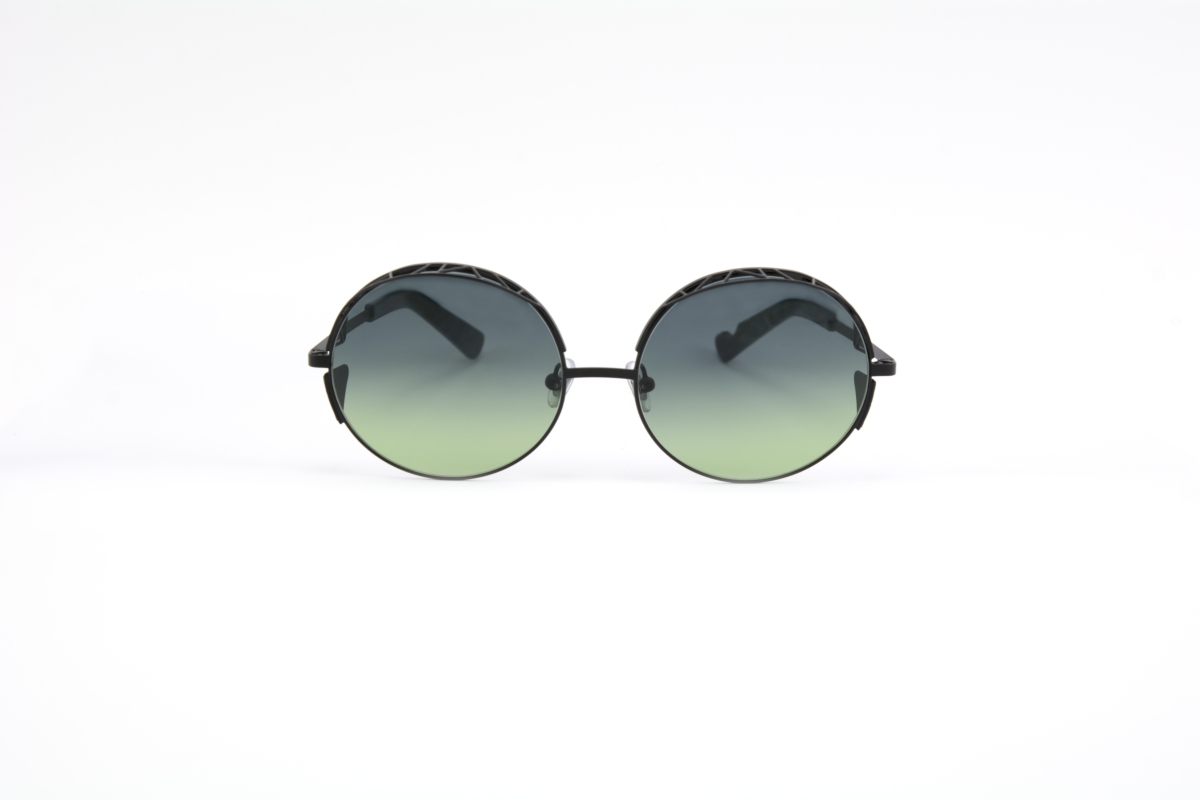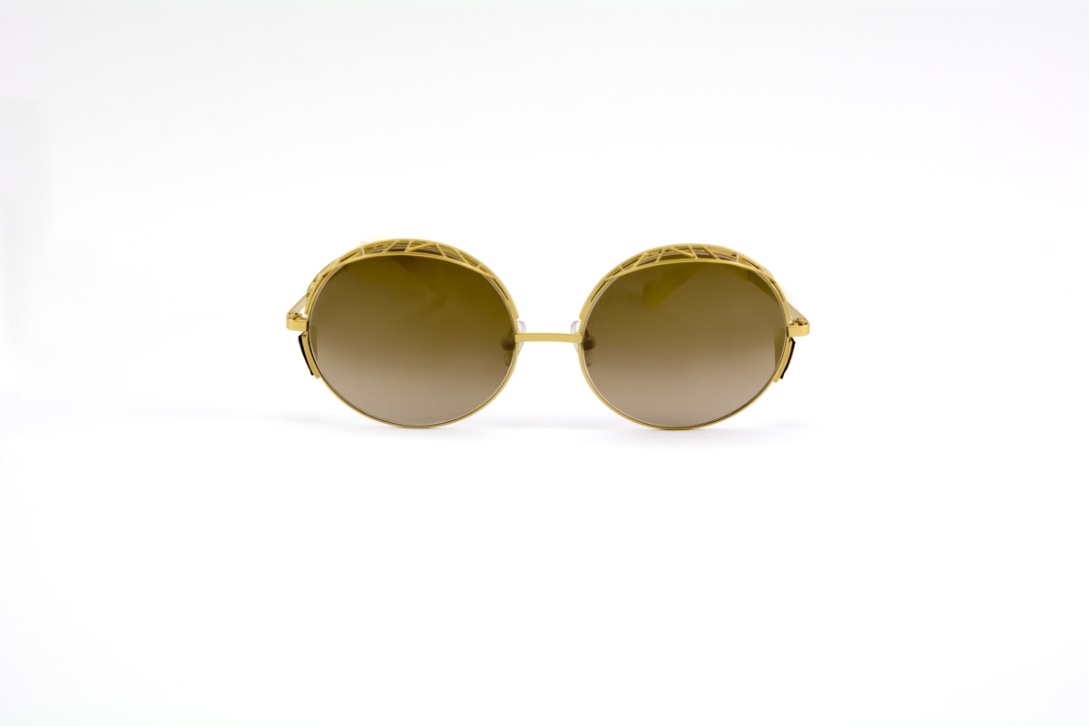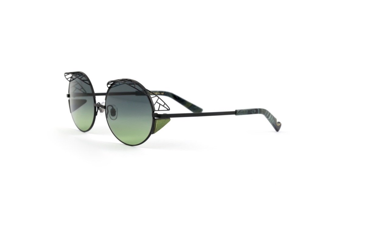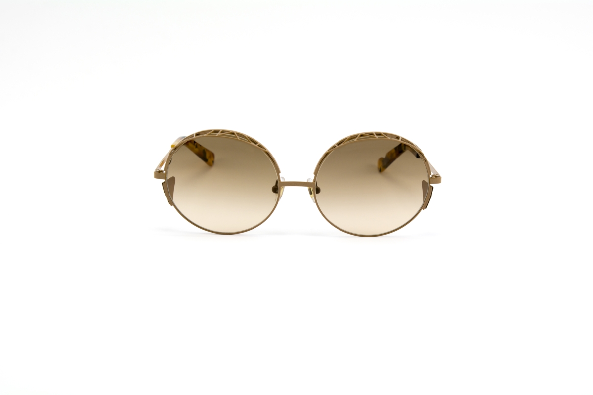 Una montatura in cui lenti Zeiss trattate con antiriflesso blu, sono incastonate in una struttura metallica che ricorda lo stile amato da Eileen Gray, in cui l’acciaio troneggia. Un materiale robusto e stabile, ma allo stesso tempo estremamente malleabile, in grado di modellarsi dando vita a virtuosismi materici. Il cigliare inconsueto di questo modello è composto da una parte superiore sporgente in acciaio, in cui ritroviamo il gioco di pieni e vuoti. In maniera speculare, tale sporgenza si riflette anche internamente, dando vita a un modello con paraocchi che riporta alla mente gli aviator, così lineare se guardato frontalmente, ma così complesso se ammirato lateralmente.