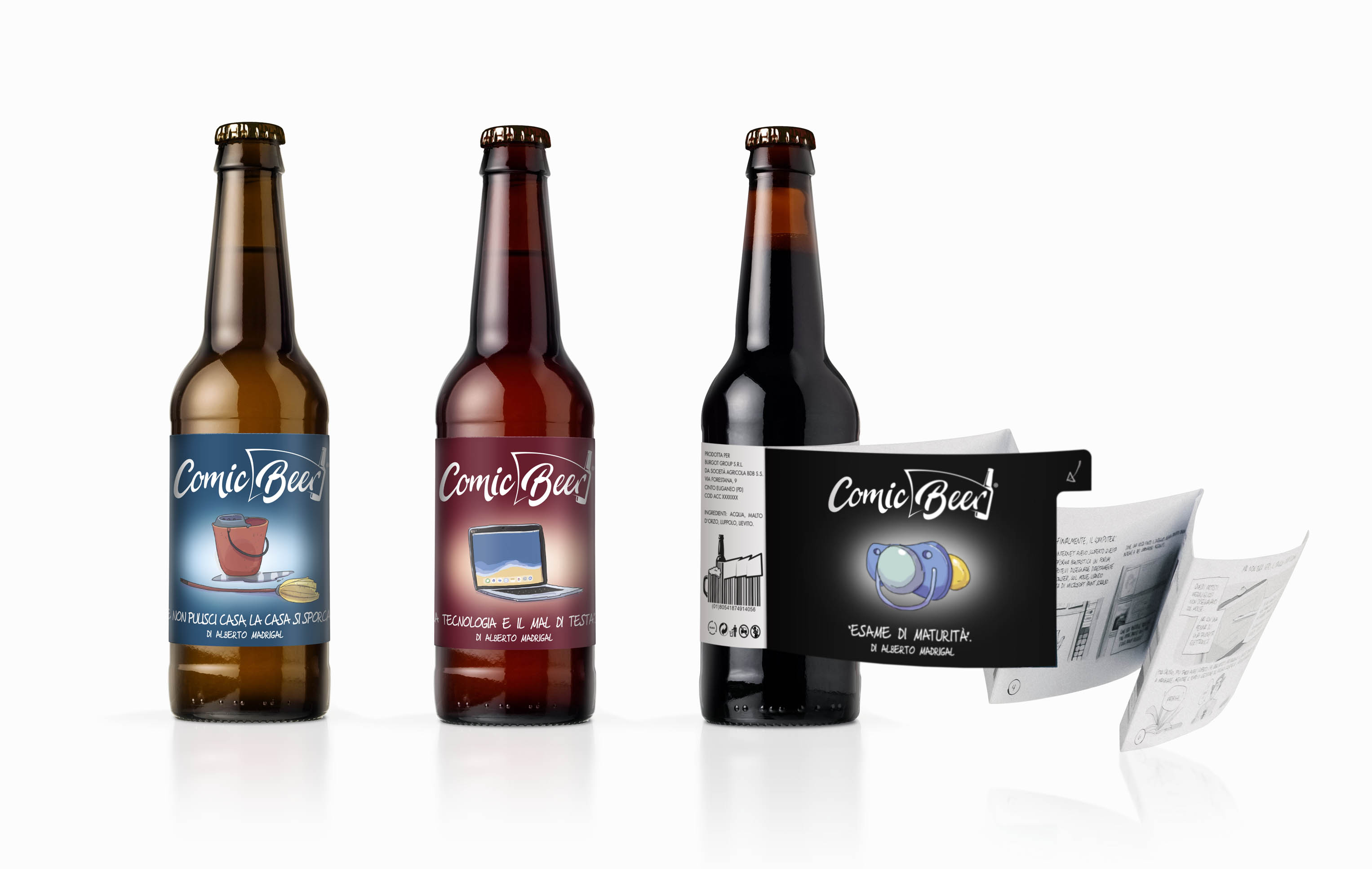 L’etichetta di ogni bottiglia è un originale libretto a fisarmonica con divertenti strisce illustrate da leggere mentre si sorseggia una delle bevande più apprezzate al mondo. La prima edizione di Comic Beer presenta tre storie del giovane ed osannato illustratore spagnolo Alberto Madrigal, abbinando la sua ironica e personale impronta stilistica ad un ad un tris di birre artigianali.