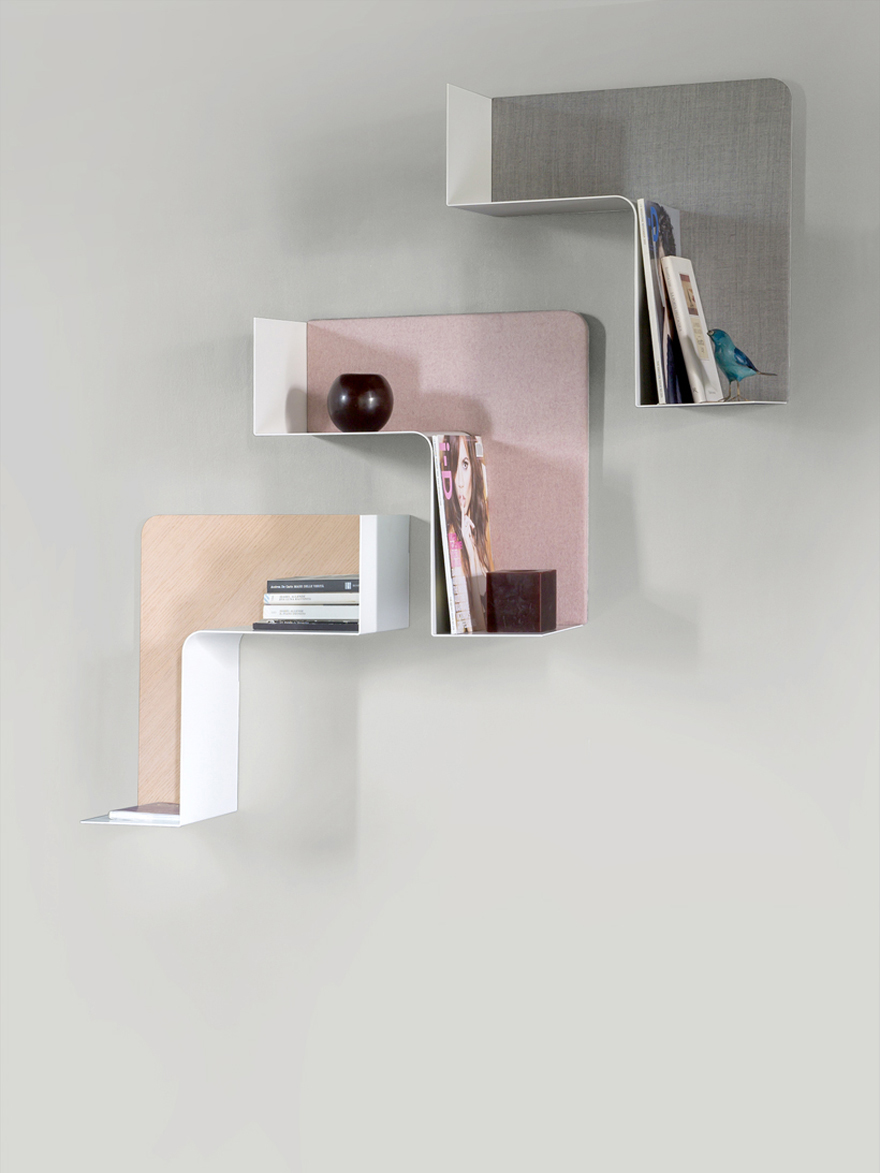 The Fishbone, designed by Favaretto&Partners, is a bookcase that allows for a variety of different sized shelves, as it is able to extend both horizontally and vertically. The angled metal-varnished pieces, available in various colors, form the support, while a plywood material forms the background, also available in a variety of finishes. It is a very unique element that can grow in both size and shape depending on the user’s preferences.