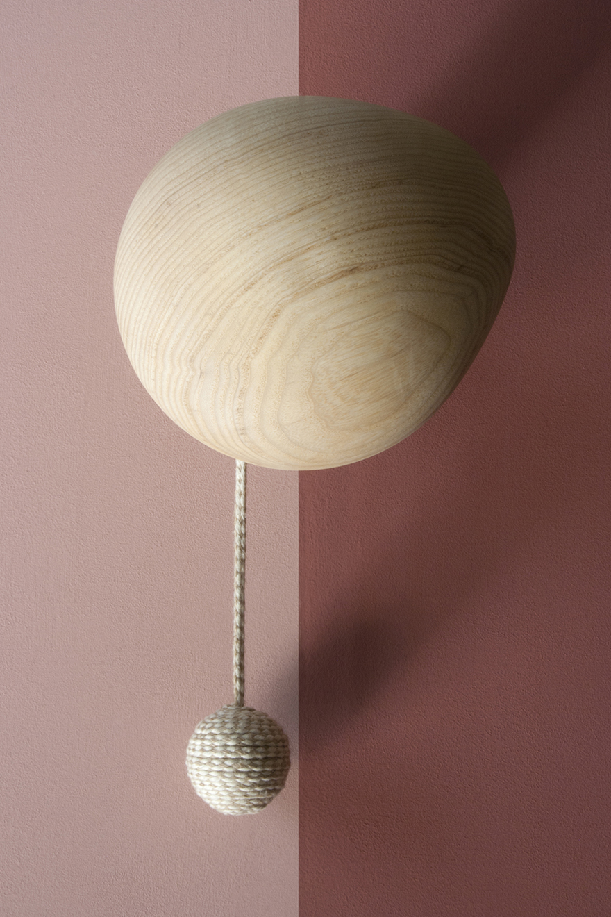 È realizzato in legno di frassino levigato a mano e finito con cera d’api vergine. La pallina è in legno di betulla rivestita in cotone naturale e juta, realizzata anch’essa interamente a mano.