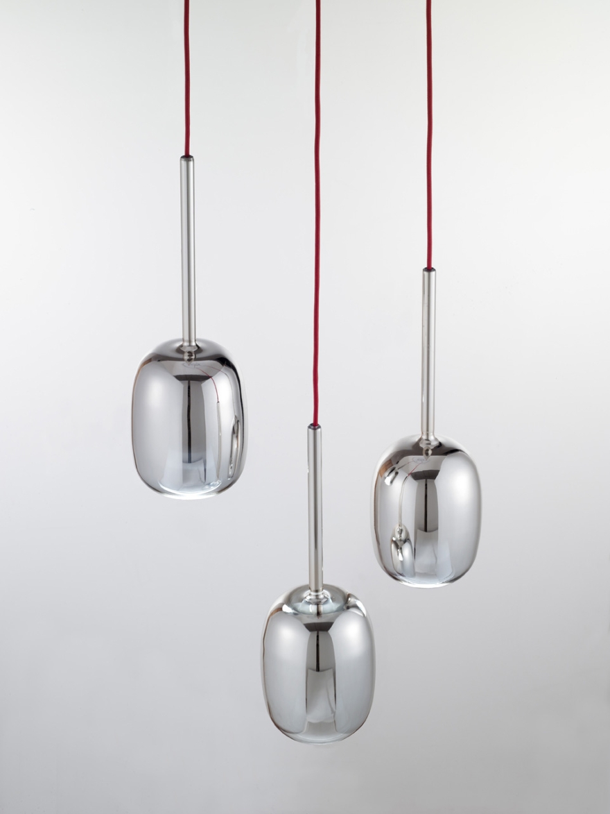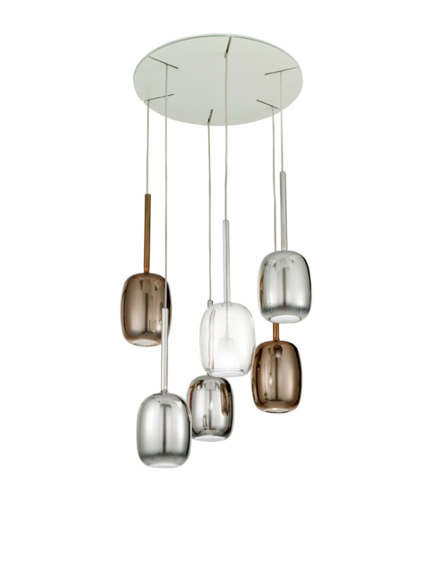 Proposta nella versione singola o in cadute multiple è caratterizzata da una raffinata forma ovale leggermente schiacciata in vetro pirex, trasparente all’esterno e sabbiato all’interno.