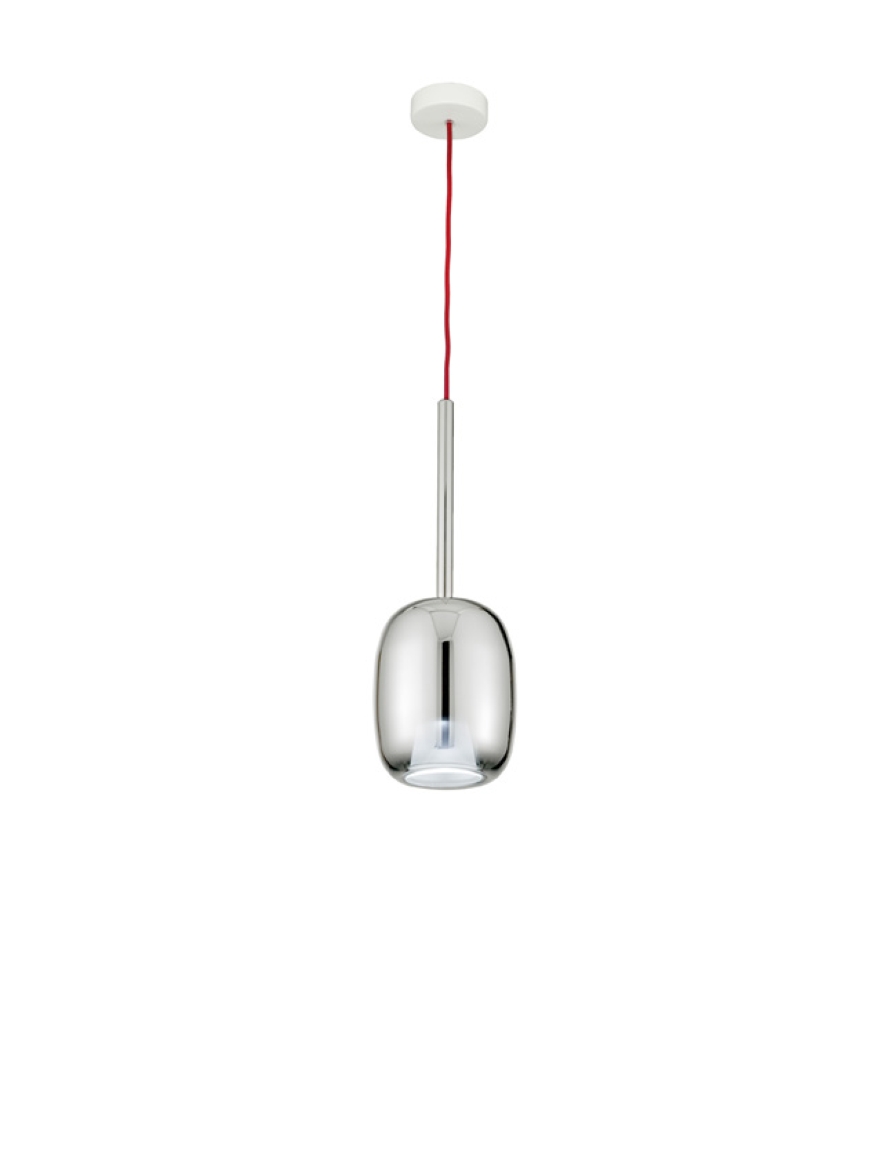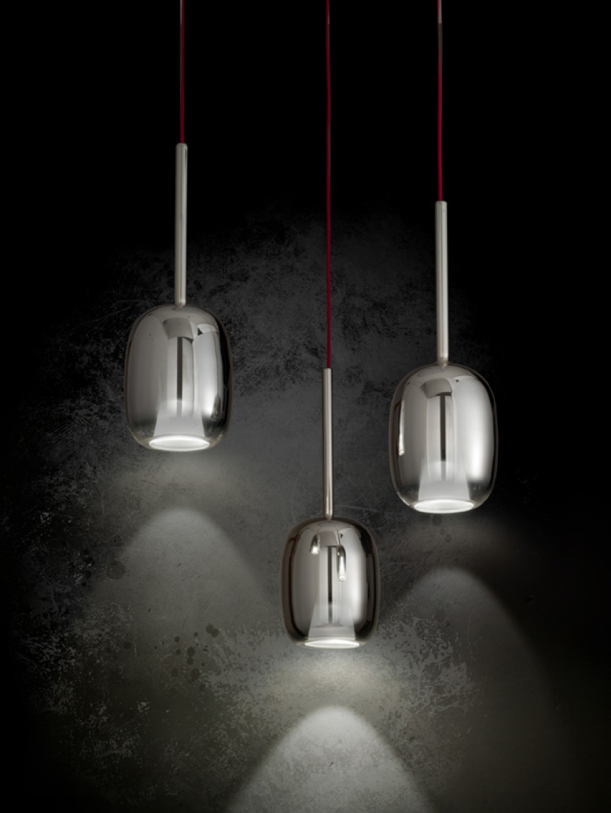 La lampada a sospensione Gioia gioca su inconsueti accostamenti cromatici: i corpi vitrei sono disponibili in cristallo trasparente, cromo sfumato e bronzo lucido (ottenuto grazie alla lavorazione della metallizzazione) e sono abbinati a cavi a vista proposti nei colori rosso, verde militare e trasparente.
