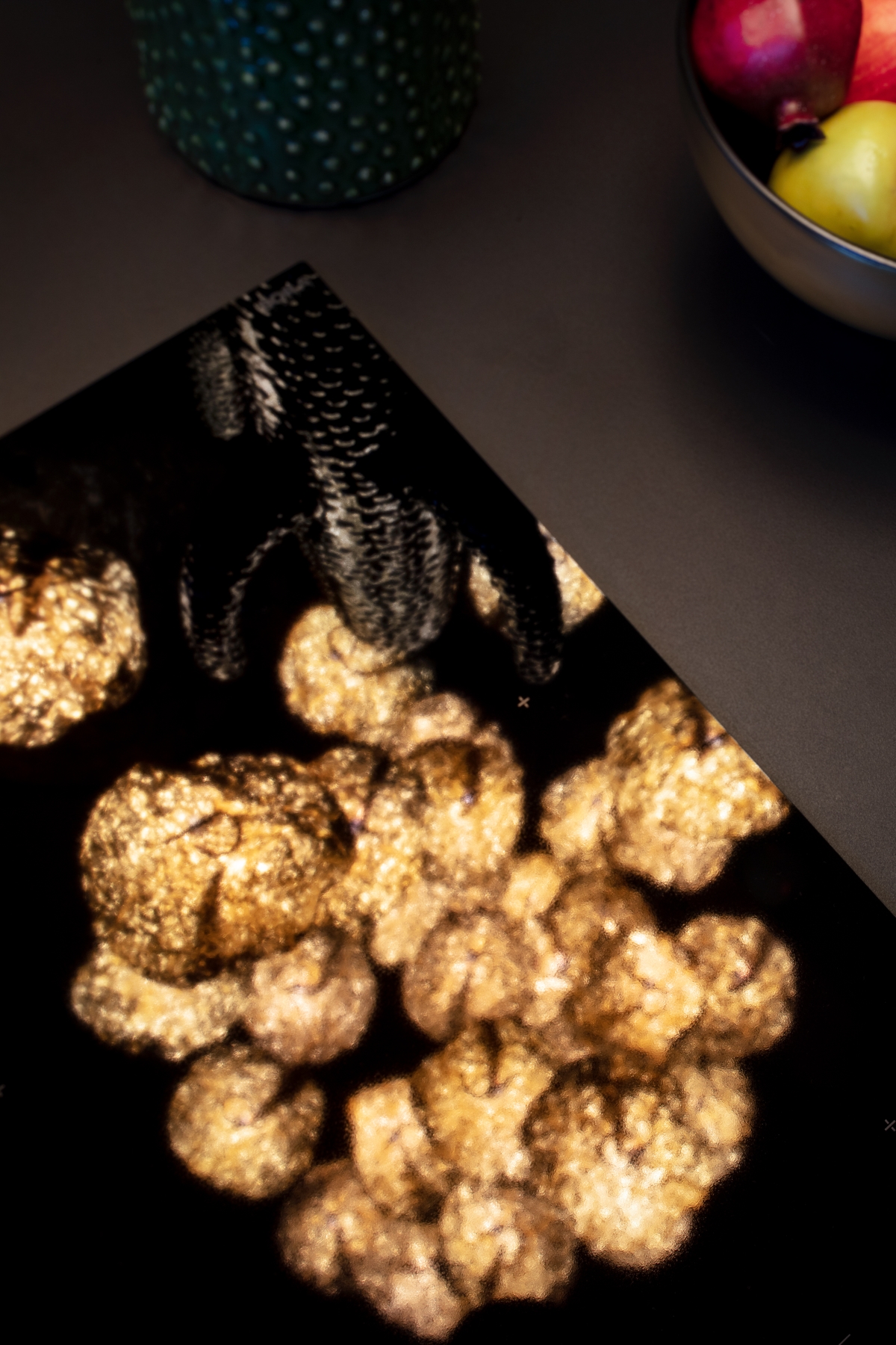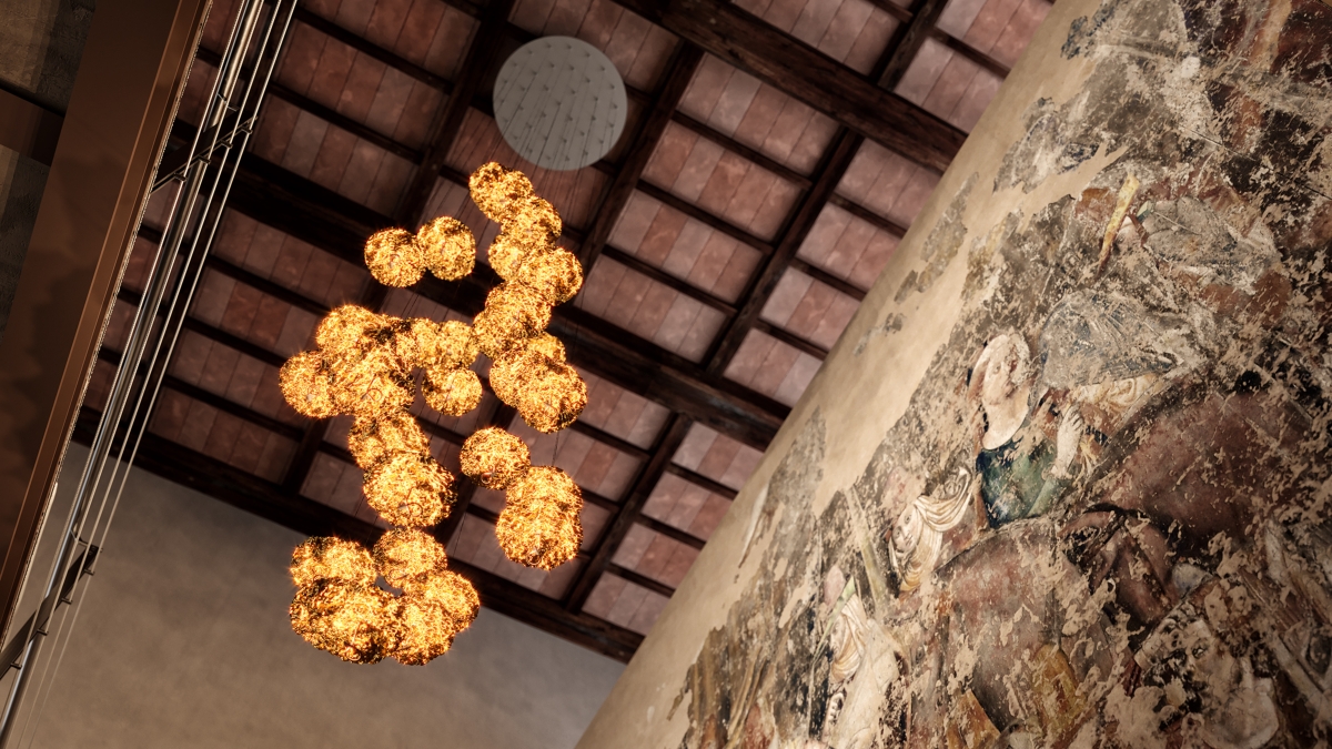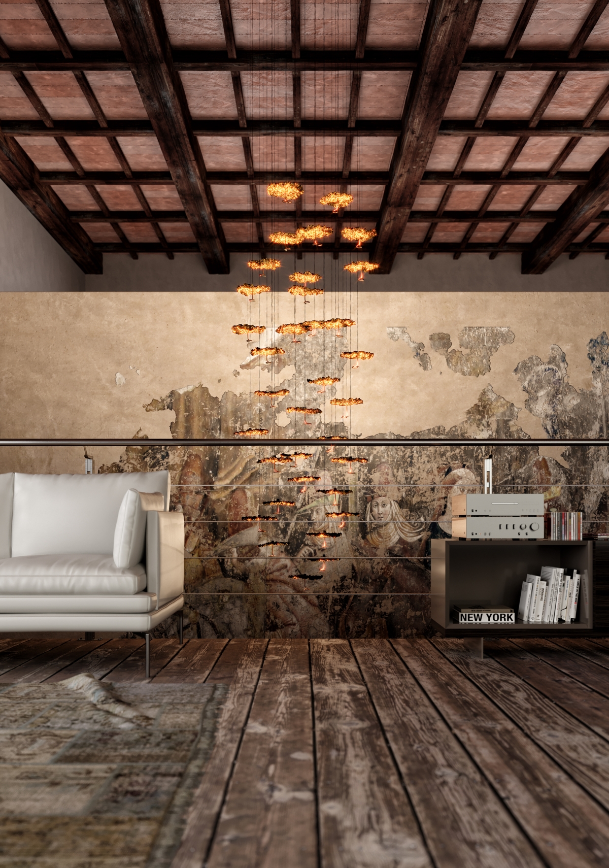 Con diametro da 20 cm, i dischi, ricoperti al loro interno da sottili e quasi impalpabili foglie color oro, ‘ospitano’ preziosi riccioli di rame e piccole gemme di vetro e luce. I LED intercambiabili e dimmerabili IGBT/Triac del nuovo chandelier, consentono di regolare l’intensità luminosa in modo da personalizzare l’atmosfera negli ambienti in cui è collocato, secondo il proprio gusto.
