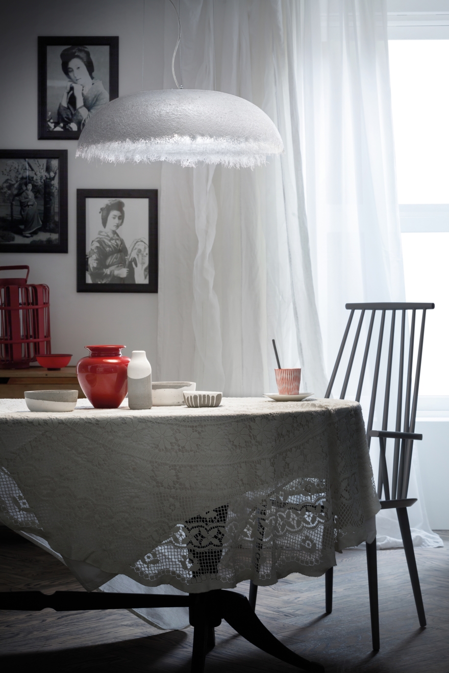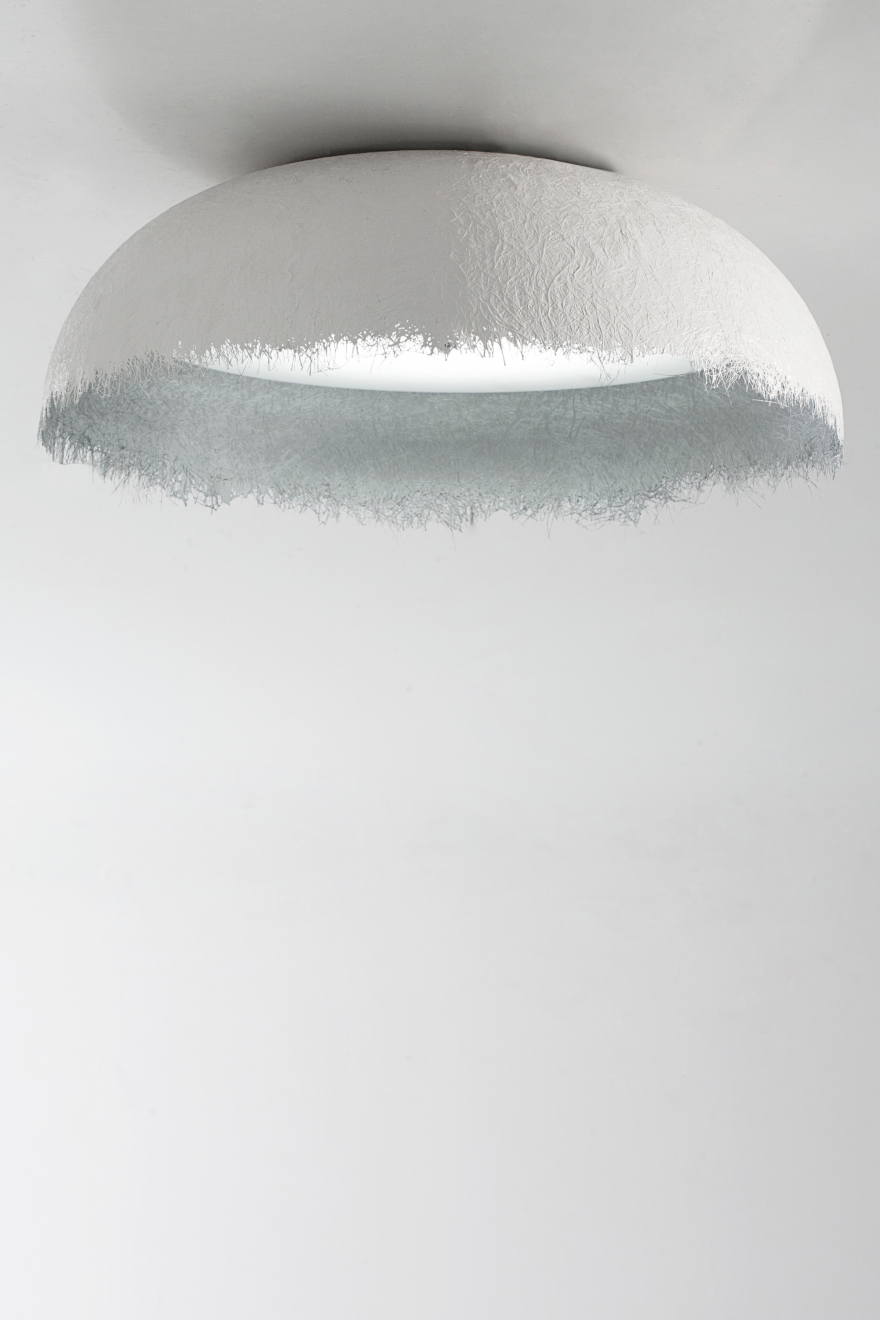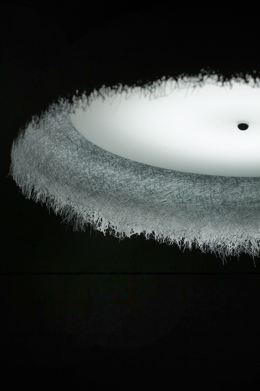 Completa le novità Lucente 2015, la collezione Egida che si ispira allo scudo mitologico greco di Zeus, da cui il suo nome. Sempre in fibra di vetro ma questa volta applicata con un effetto sfrangiato, ogni lampada diventa così un pezzo unico. Disponibile nelle versioni: sospensione, plafoniera ed applique. Le finiture sono nera o bianca opaca all’esterno e foglia oro o argento all’interno. Diffusore in PMMA opale e sistema di illuminazione LED.