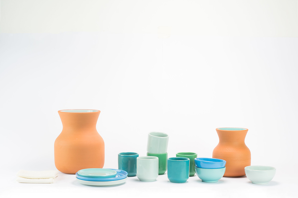 L’esterno del Kolshi -naturale e non smaltato- si combina con la superficie lucida dell’interno e degli altri pezzi del set, con toni di smalto ispirati ai colori dell’acqua. Grazie alla proprietà naturale di raffreddamento della terracotta, il kolshi può essere usato per mantenere fresca l’acqua attivando il processo di evaporazione una volta bagnata la superficie esterna della caraffa.