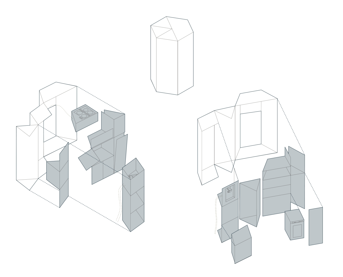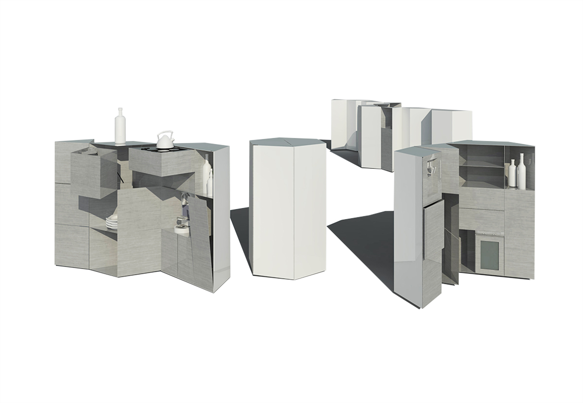 KOZI è un elemento cucina versatile. Un pezzo di design solido, esagonale, formato da una struttura portante esterna in alluminio laccato da 2mm, personalizzabile in diversi colori e tipi (A, B) in base alla disposizione delle cerniere e alle chiusure alle estremità. Lo spazio interno è delimitato da diversi ripiani e cassetti in lamiera di alluminio di colore naturale, che integrano funzioni e piccoli elementi della cucina: macchina per il succo, macchina del ghiaccio, macchina per il caffè, piano cottura in vetroceramica, lavello, ecc…