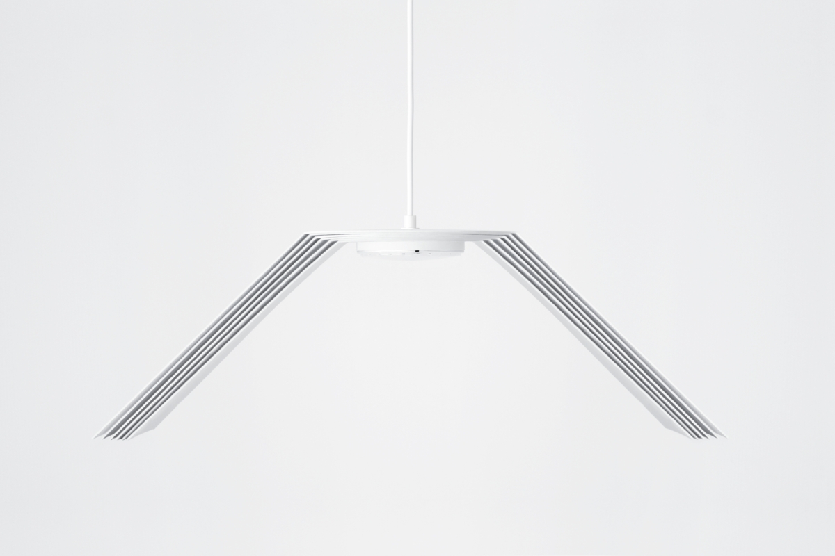 Utilizzando la tecnologia di taglio laser sono state ottenute le ali che, sovrapposte, ruotano su se stesse e permettono di gestire la luce e di creare geometrie ed effetti di illuminazione.