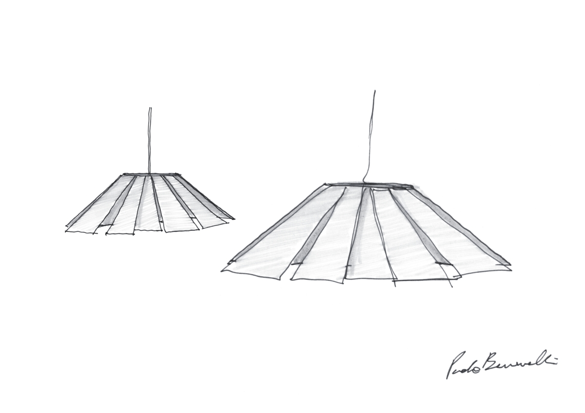 La lampada Eolique disegnata da Paolo Benevelli, è nata lavorando su una forma geometrica e sullo sviluppo del suo movimento.