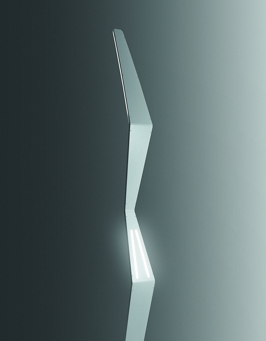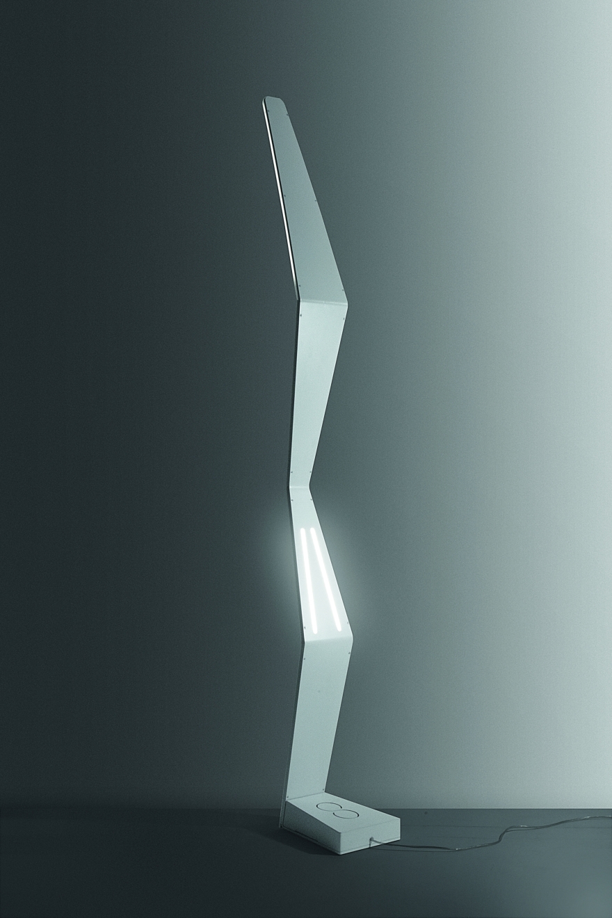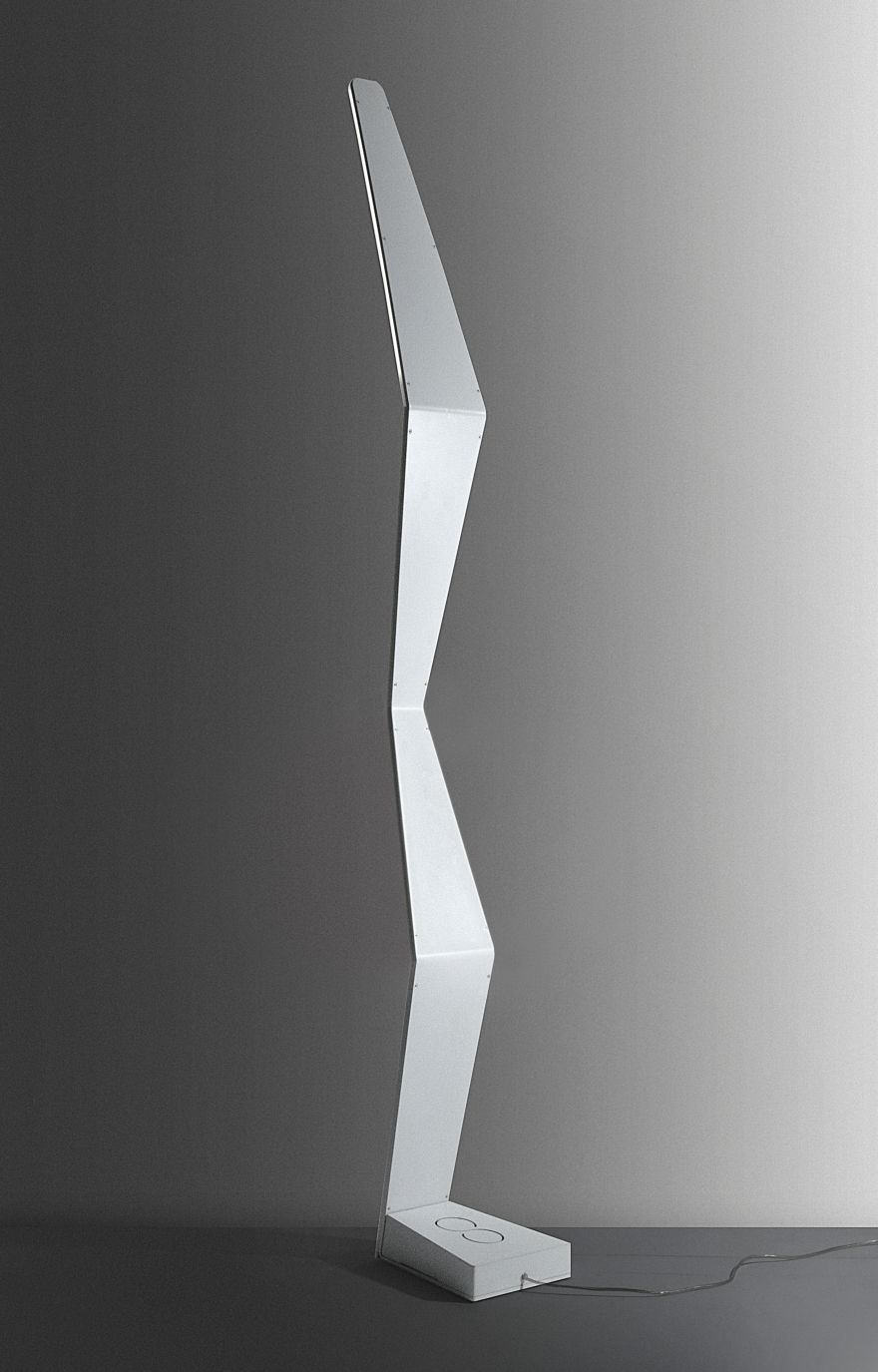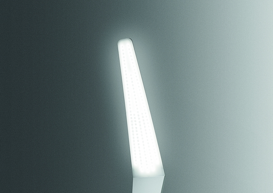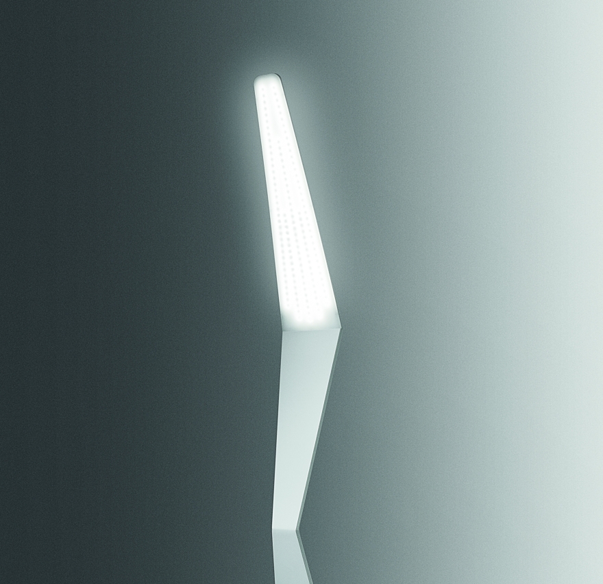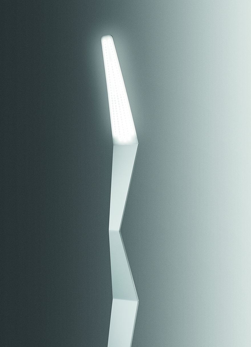 L’illuminazione della versione piantana, avviene mediante un diffusore posto sulla parte sommitale ed in corrispondenza della prima “piega” frontale. La stessa può ricevere anche una retro illuminazione di “effetto” da due feritoie – sempre illuminate a Led -, poste su una delle pieghe della scocca retrostante.