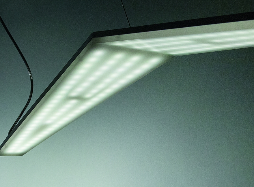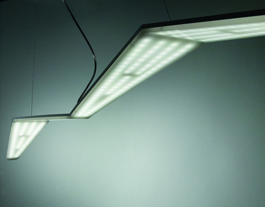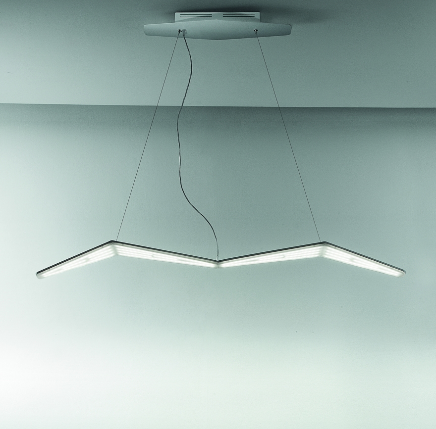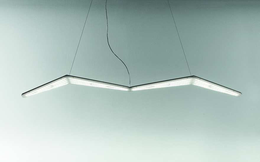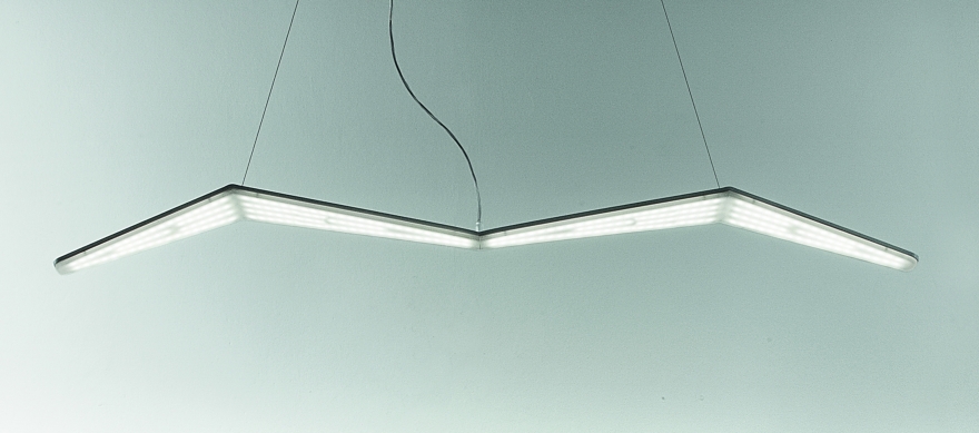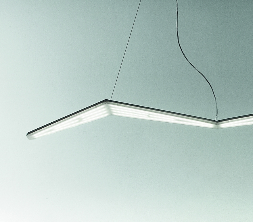 La sospensione, mostra invece un’illuminazione che percorre tutto il corpo sottostante della lampada, attraverso le sfaccettature del diffusore.