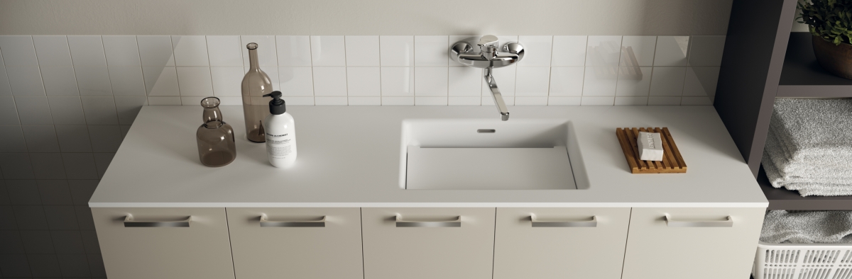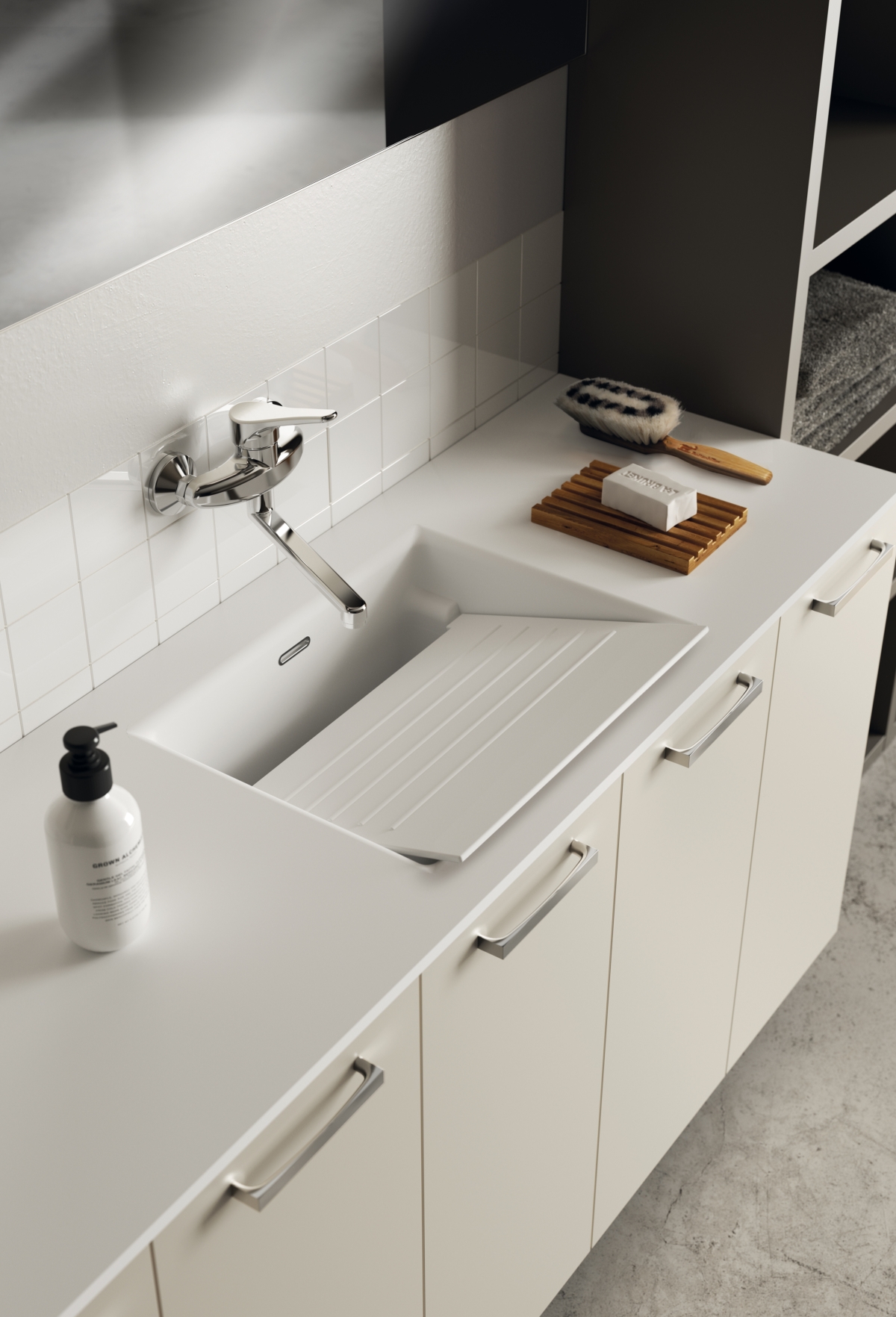 Anche il lavatoio in mineralmarmo, altro protagonista dell’ambiente lavanderia, è stato disegnato e prodotto in esclusiva per Scavolini in modo da integrarsi perfettamente con la base da 70cm. Le sue dimensioni e profondità permettono che venga sfruttato per le attività domestiche in modo facile e comodo, grazie anche alla tavoletta estraibile, anch’essa realizzata in mineralmarmo.
