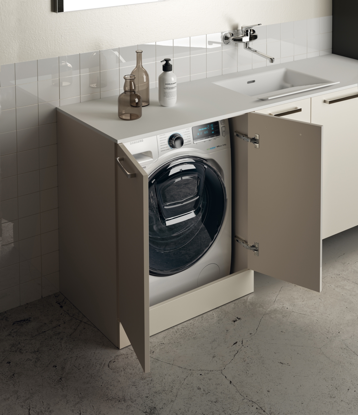 Laundry Space è disponibile in un’ampia gamma di finiture, con top e profili di serie. Le maniglie e le prese attingono all’ampio catalogo Scavolini Bathrooms per assicurare la massima continuità stilistica.
