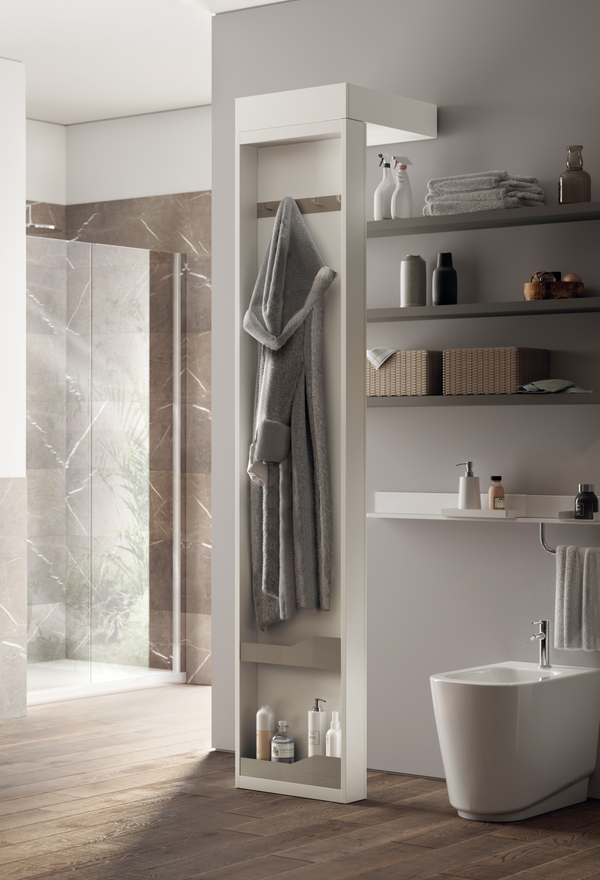 Altri elementi estremamente utili sono il carrello biancheria, che può essere spostato e riposto sotto il piano di lavoro; la parete portaccessori in monofinitura bianco opaco che, girando su se stesso, permette di sfruttare entrambe i lati grazie a mensole e ganci porta abiti da un lato e, dall’altro da specchiera e porta salviette.
