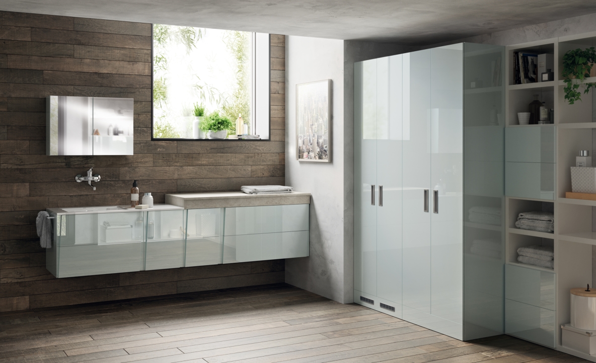 Ambiente bagno arredato con la collezione Idro, integrata con gli elementi lavanderia del progetto Laundry Space di Scavolini.