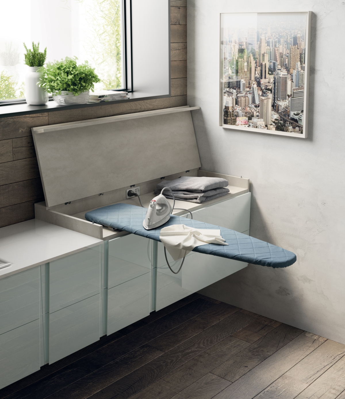 Il cuore di questo progetto risiede nell’idea del nascondere per organizzare e assicurare la pulizia stilistica più assoluta. Ne sono un esempio l’asse da stiro estraibile dallo spessore del piano; i pensili dotati di stendipanni, anch’esso estraibile e l’armadio ripostiglio e per elettrodomestici ideali per riordinare il materiale per la pulizia e il lavaggio.