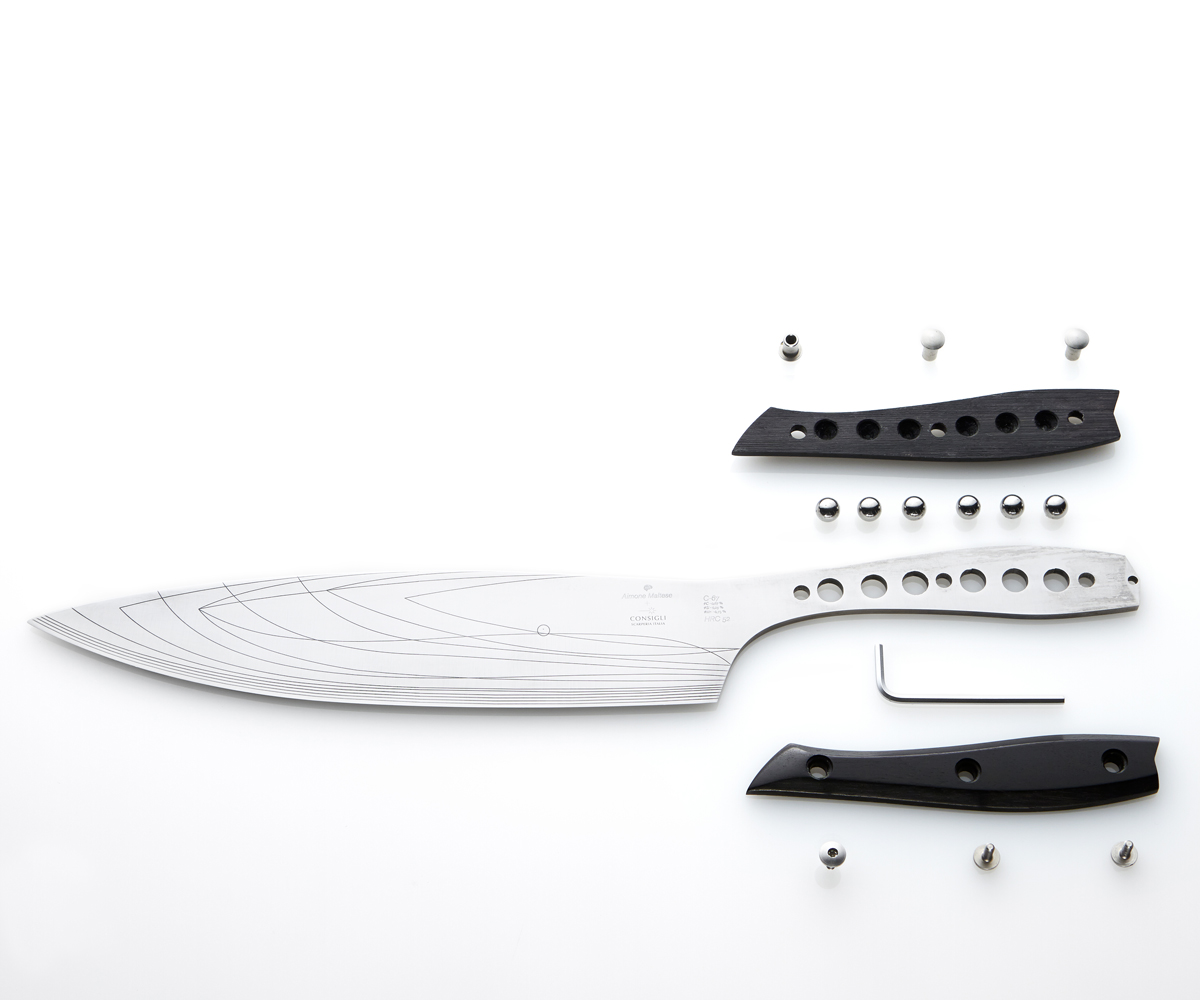 Secondly, the initial shape of the blade, and the contours of its future wearing away. Users may also opt to choose one of the forms stored in the online Encyclopaedia, which will grow as customers customise their knives). The software will automatically recalibrate the handle, so as to ensure that your knife is always weighted. Thirdly, the selection of materials and finishes for the inox blade and handle.