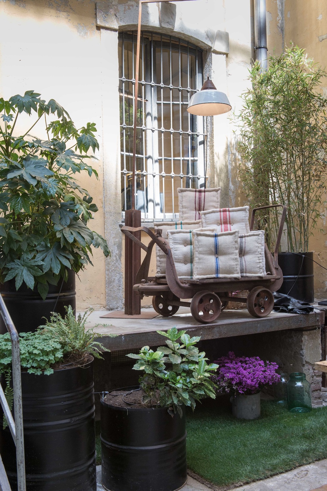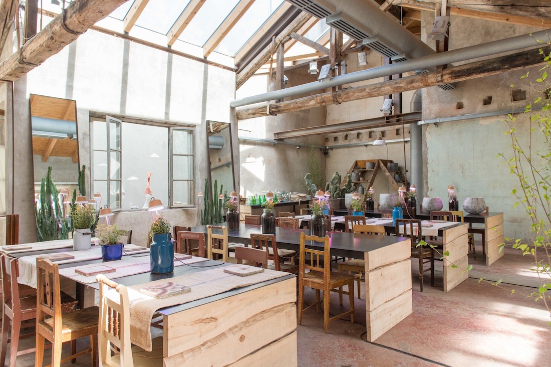 Vale la pena di salire i gradini dell’antica scala in ferro che porta al primo piano per avere una vista complessiva dell’allestimento e, contemporaneamente, accedere a quella che si rivela una sala da pranzo d’eccezione, palcoscenico dell’opera culinaria di Badeggs, team di giovani cuochi che hanno portato in scena piatti originali curati dallo chef Federico Bassi. La mise en place, realizzata con piatti e posate All’Origine rimanda a bellissimi tempi passati creando un particolare contrasto con le lampade Cynara di Bulbo, l’ultima novità sulla scena delle soluzioni per coltivare in casa e in spazi ristretti. Direttamente dalle mani dei migliori artigiani italiani, Cynara combina un paralume in terracotta di Faenza verniciata a mano con un’elegante struttura in alluminio anodizzato. Consumi bassissimi grazie all’utilizzo di LED di ultima generazione (7 watt, come il modem del wifi di casa), e l’elemento accompagna la crescita di ortaggi, piante aromatiche, fiori e piante grasse in casa tutto l’anno. Un’oasi lussureggiante, decisamente ricca di stile.* In questo caso sono le piante ornamentali/commestibili di Res Naturae, progetto nato dall’idea di due studenti universitari di Scienze agrarie. A completare il tutto i vasi in ceramica di Bulzaga, risultato di una difficile tecnica di lavorazione dell’impasto ceramico, con il quale si ottiene un prodotto molto sottile, simile alla porcellana. Il valore aggiunto è dato dallo stampo, sempre realizzato a mano, che gli conferisce una caratteristica visiva e tattile molto simile alla venatura del legno. Il prodotto si può’ personalizzare in differenti sfumature di colore, seguendo le esigenze e richieste di ogni singolo cliente.