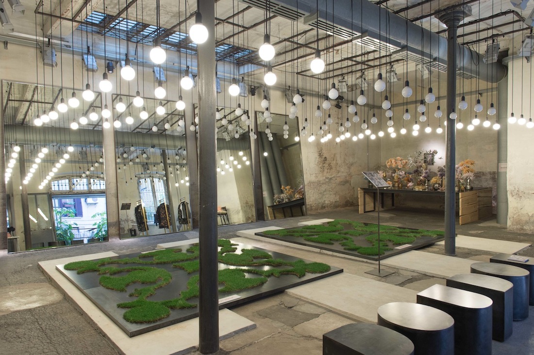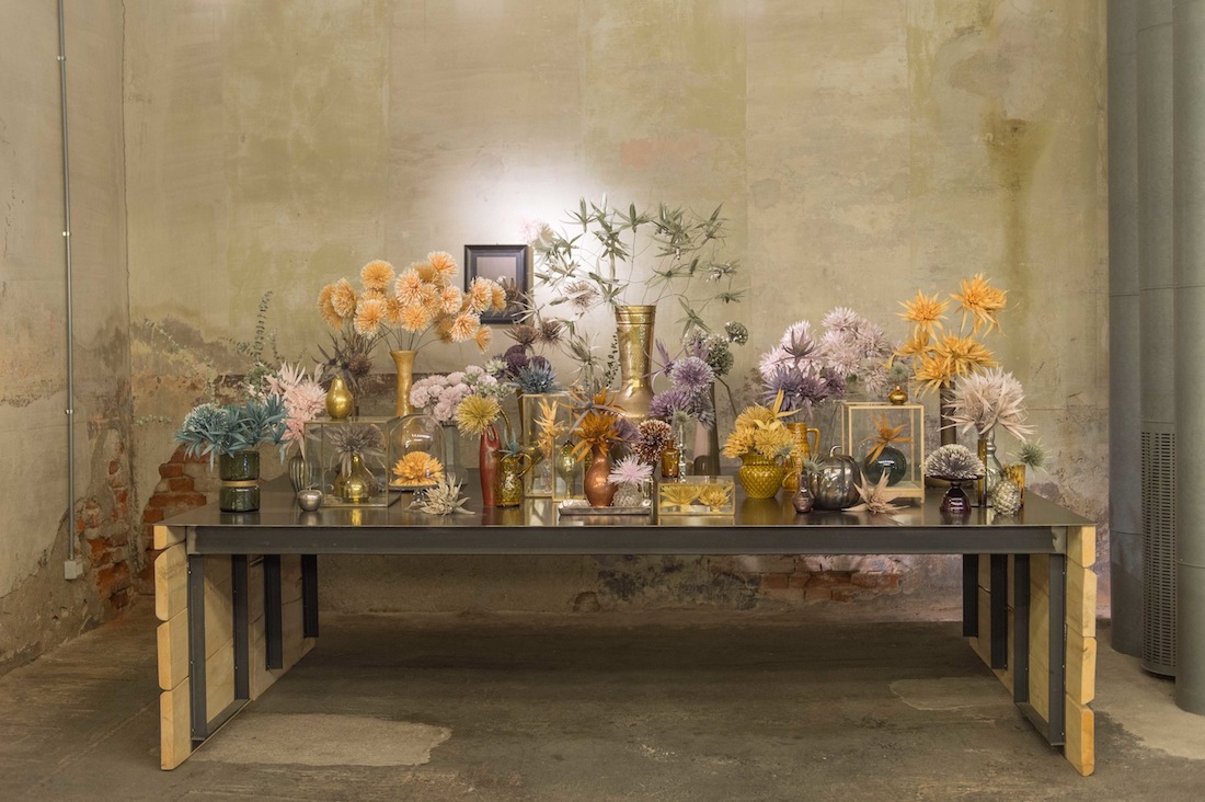 Le idee, i colori, le forme si mescolano con gesti nati dalla creatività di 11 brand che amano e credono in un design fatto di soluzioni intelligenti, brillanti e originali in cui la poesia segue una funzionalità mai banale. Varcata la soglia del civico 9 in Piazza XXV Aprile a Milano, il tempo misurato dai comuni orologi risulta magicamente cristallizzato. Ad accogliervi, le quattro mura metafisiche di Madame “Stanza del Pensiero”, un angolo di natura sapientemente accostata, realizzato dalla paesaggista Silvia Ghirelli con la complicità dei bossi di Minari Buxus e incorniciato in un’installazione composta da grandi vasi in vetro soffiato di All’Origine che accolgono, proteggendoli, i fiori di carta crespa di Andrea Merendi, fiori che ritroviamo all’interno dello spazio in un allestimento da togliere il fiato. Merendi, in collaborazione con la Cartotecnica Rossi, presenta, in questa edizione del Fuorisalone, la nuova cartella cromatica: inconsuete tonalità polverose ed eleganti colori vintage che sembrano emergere da vecchi cassetti chiusi da anni.