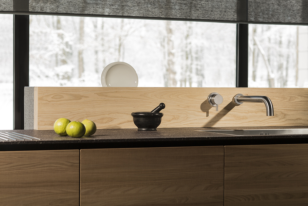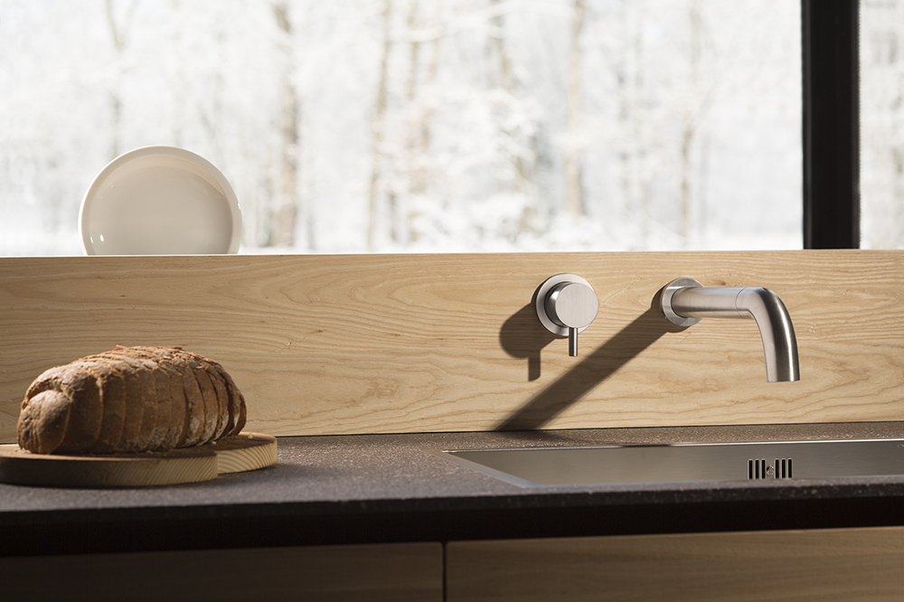 Un gruppo rubinetteria spogliato da ogni decoro ed elemento aggiuntivo per restituire l’essenza del miscelatore e del suo meccanismo, che diventa il centro della composizione. Lo sviluppo della canna estraibile rimane un dettaglio discreto non predominante ma incassato a parete.