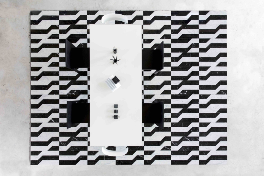 IN D U S T R Y è un pavimento in marmo lineare che grazie alle tre lunghezze, ai tagli e al contrasto dei colori crea geometrie oblique inaspettate e dinamiche. Il listello rettangolare viene smussato a 45 gradi, un semplice gesto che rende la collezione IN D U S T R Y elegante e adatta anche per il contract.