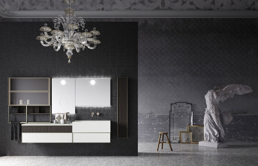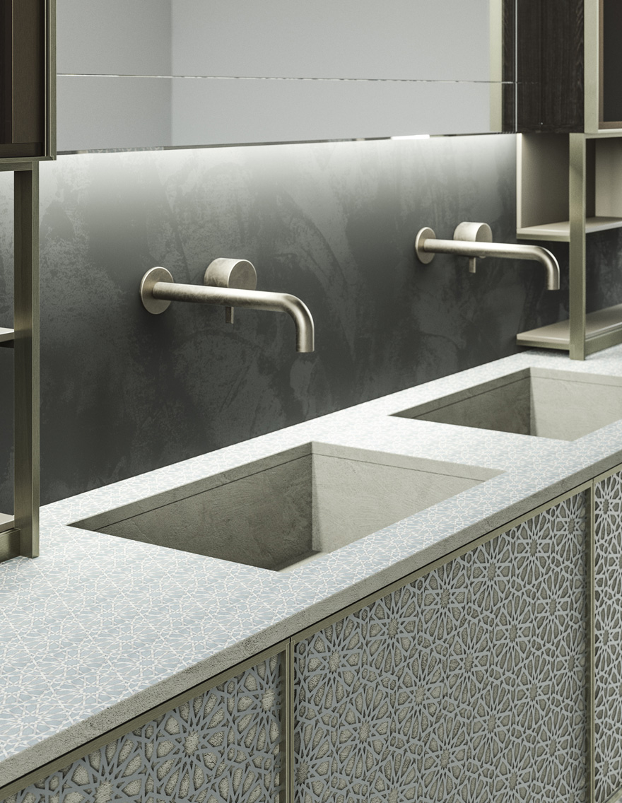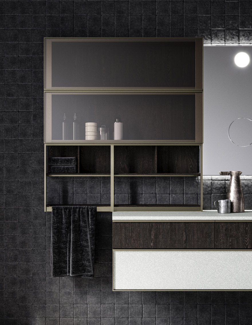 Le boiserie in alluminio sono pensate per armonizzare le composizioni, collegando mobili, top e specchi, oppure possono essere utilizzate come elementi singoli, con funzione decorativa.