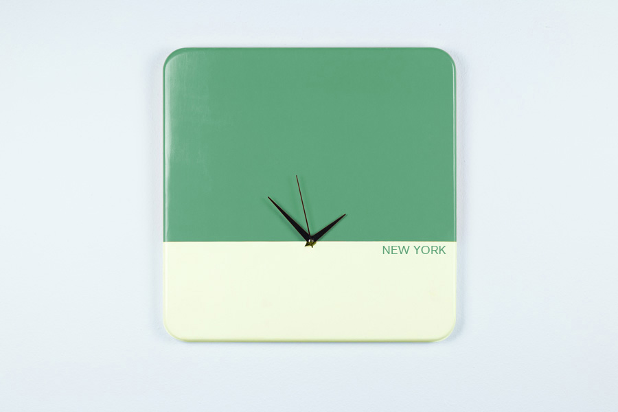 Set di tre orologi da parete con quadrante di colore diverso, in legno massello di faggio, laccato con vernici ad acqua atossiche ed ecologiche. Realizzato completamente a mano. Ognuno indica l’ora di una famosa città.