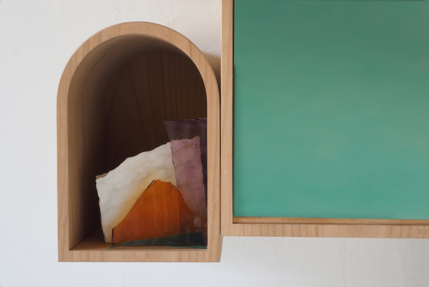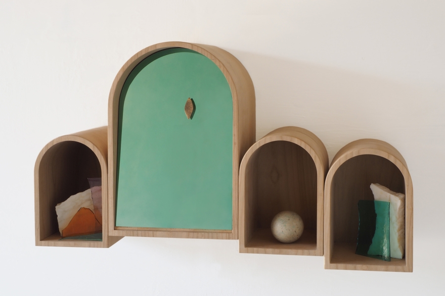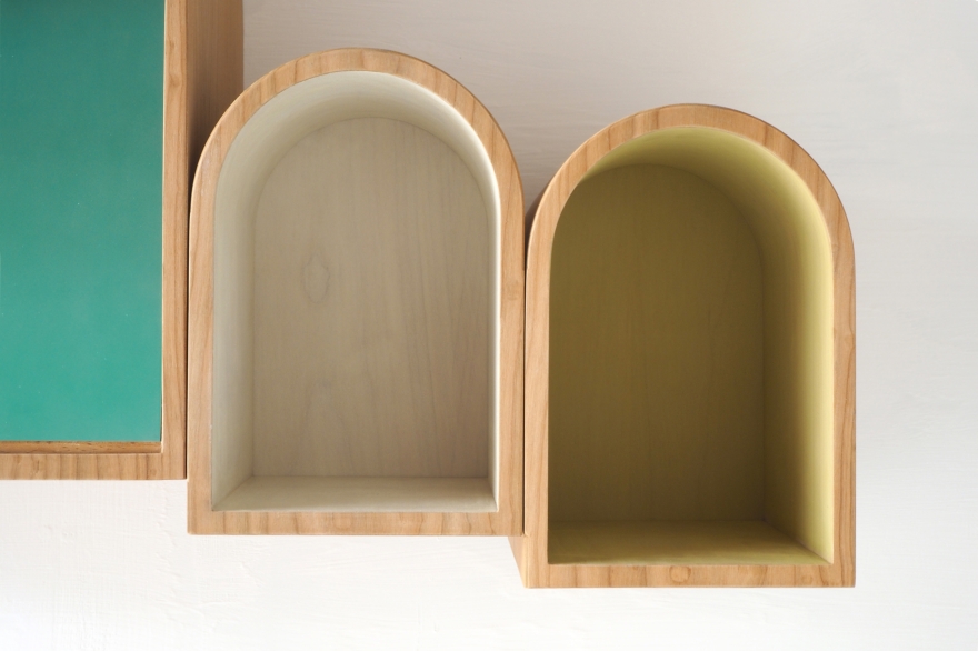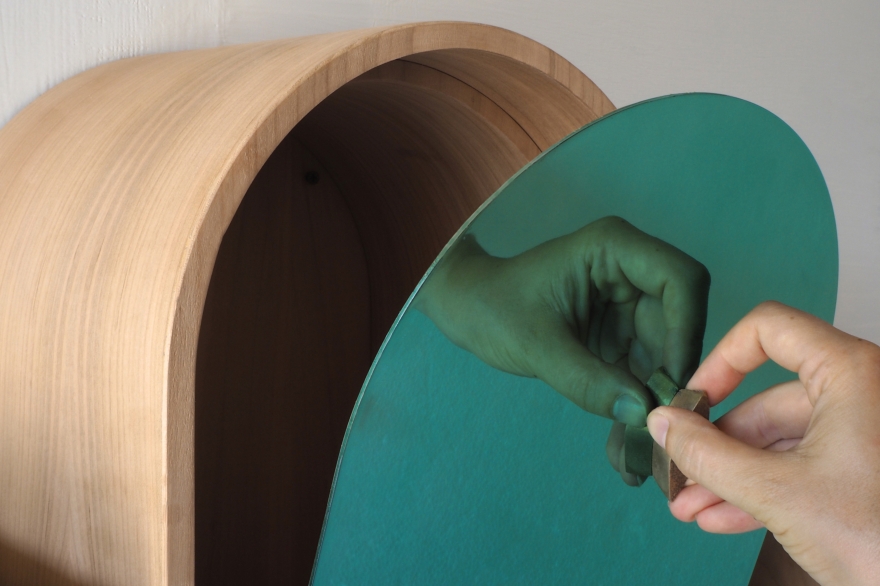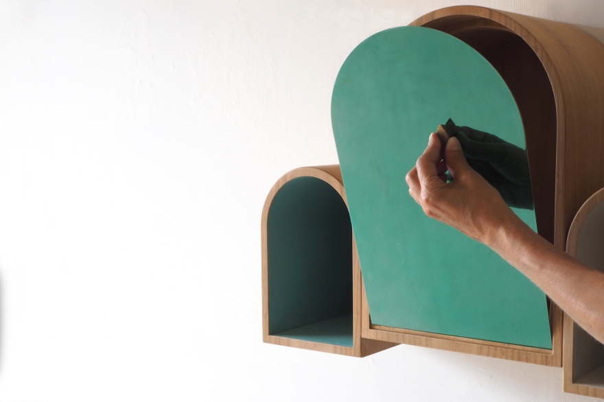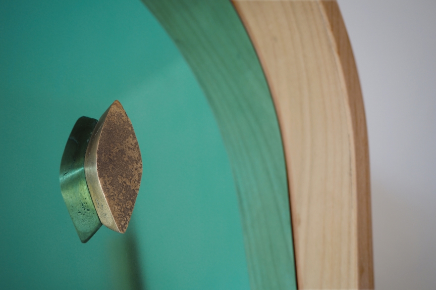 Rivoalto misura 80 cm L x 48 H e 23 P ed è realizzato in ciliegio, con le arcate declinate nelle tonalità verde acqua, bianco avorio e giallo sabbia; la distesa marina/anta a ribalta è composta da una lamina d’acciaio anch’essa in verde acqua; la gondola/maniglia è invece in bronzo grezzo.