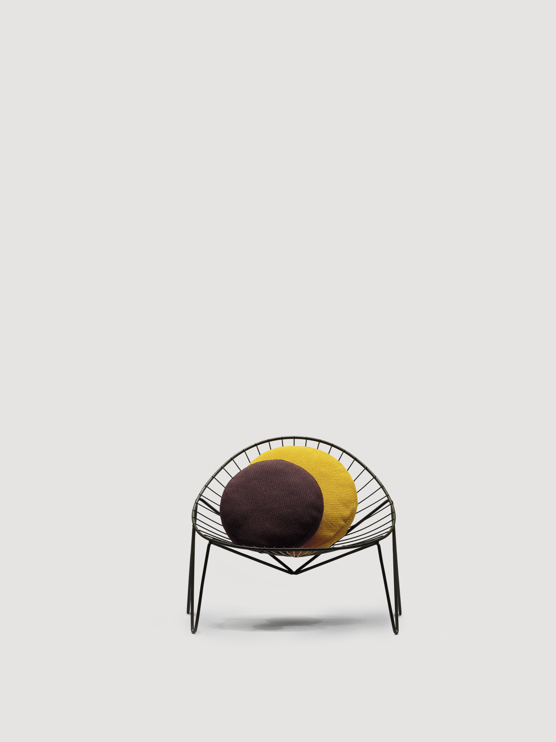Per la poltrona, sono disponibili cuscini circolari in due dimensioni, da disporre liberamente all’interno della scocca.