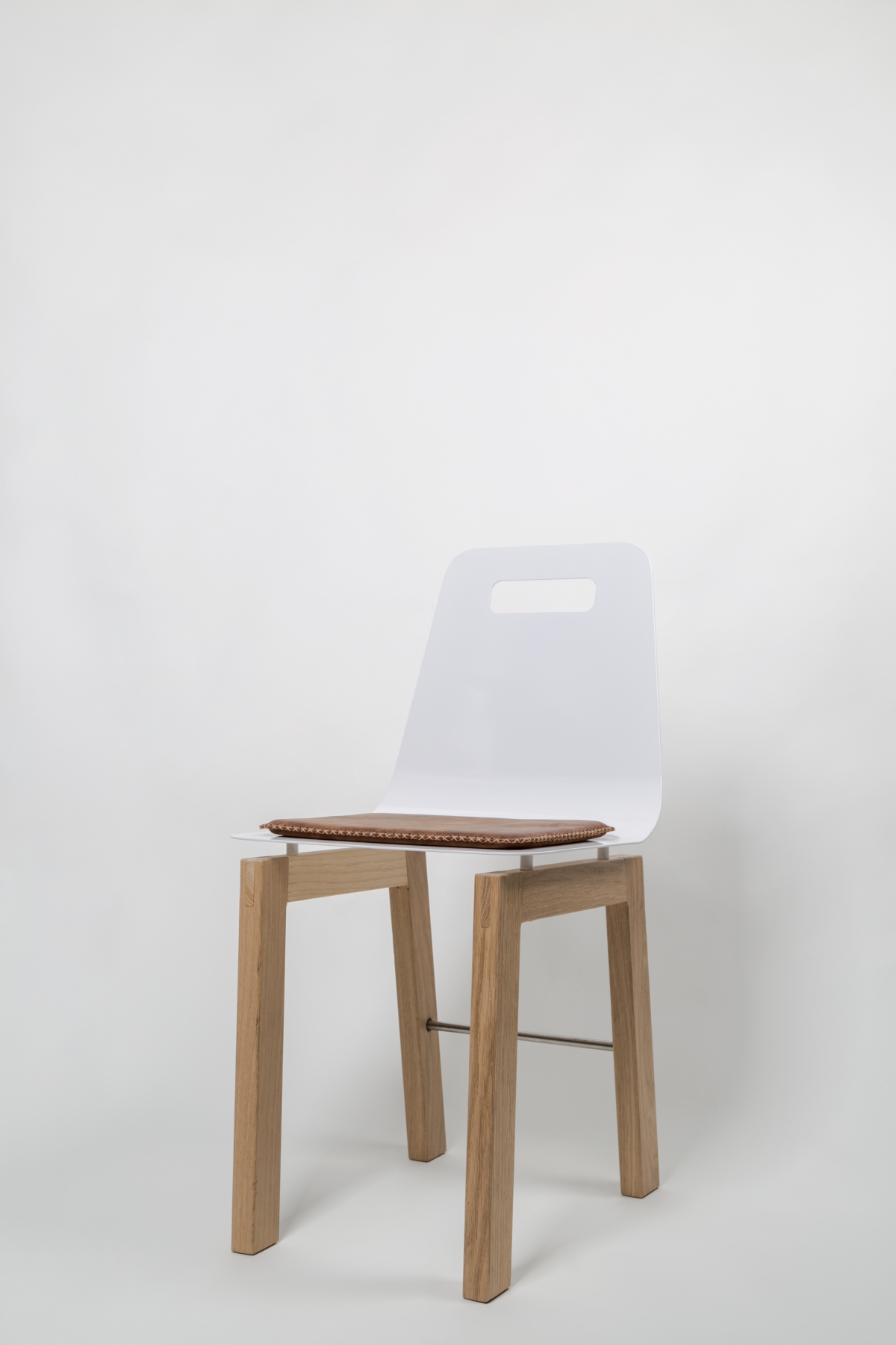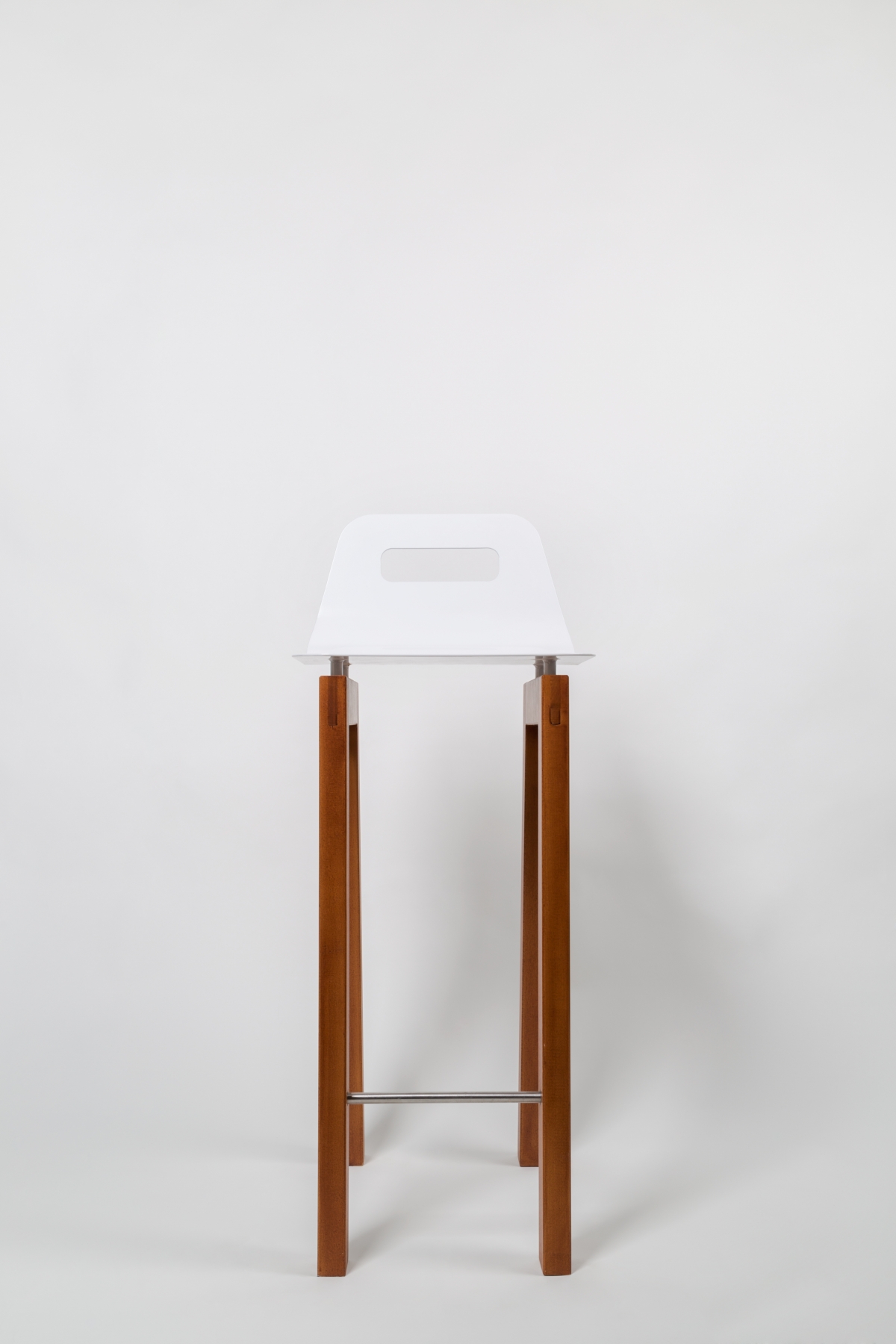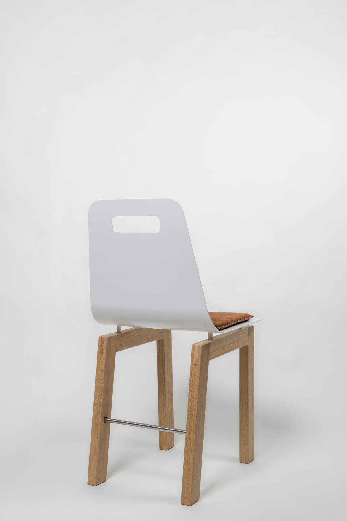 “Timo chair”e “Timo stool”, design Michelangelo Olivieri per m12 AD. Seduta in metallo smaltato e struttura in legno massello dalle infinite possibilità di personalizzazione.