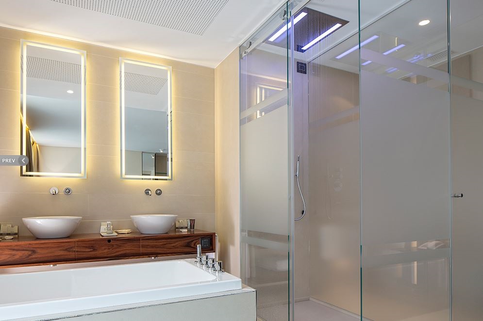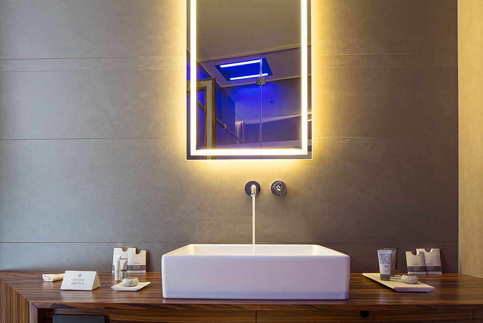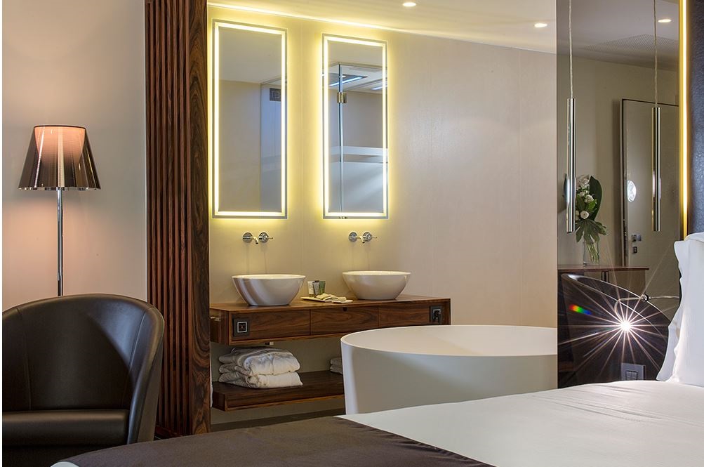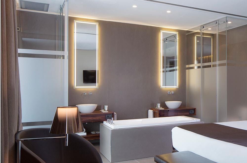 L’albergo si articola in un piano terra con hall, camere e corte interna con giardino pensile che sovrasta gli scavi; un primo piano con altre camere e un piano interrato con sala colazioni affacciata sull’area archeologica, una sala riunioni e una moderna SPA. Una struttura concepita all’insegna della massima qualità costruttiva e di un elevato standard, che ha scelto la bellezza in ceramica delle serie Kerlite Elegance e Kerlite Over di Cotto d’Este per i pavimenti e i rivestimenti.