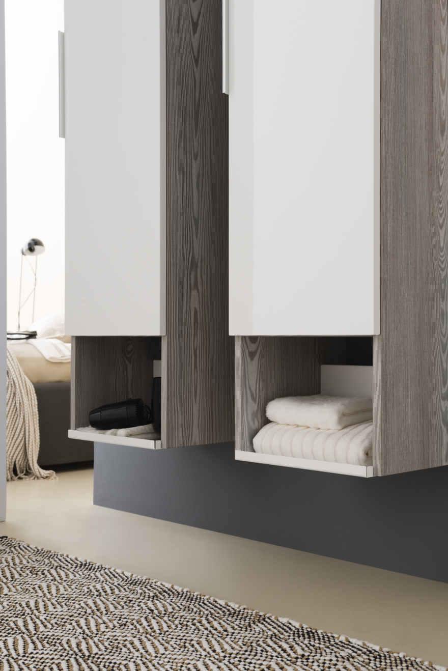 Le nuove finiture proposte, in aggiunta alla gamma dei laccati, hanno i toni caldi delle essenze naturali: pino grigio, quercia bianco e quercia tabacco.