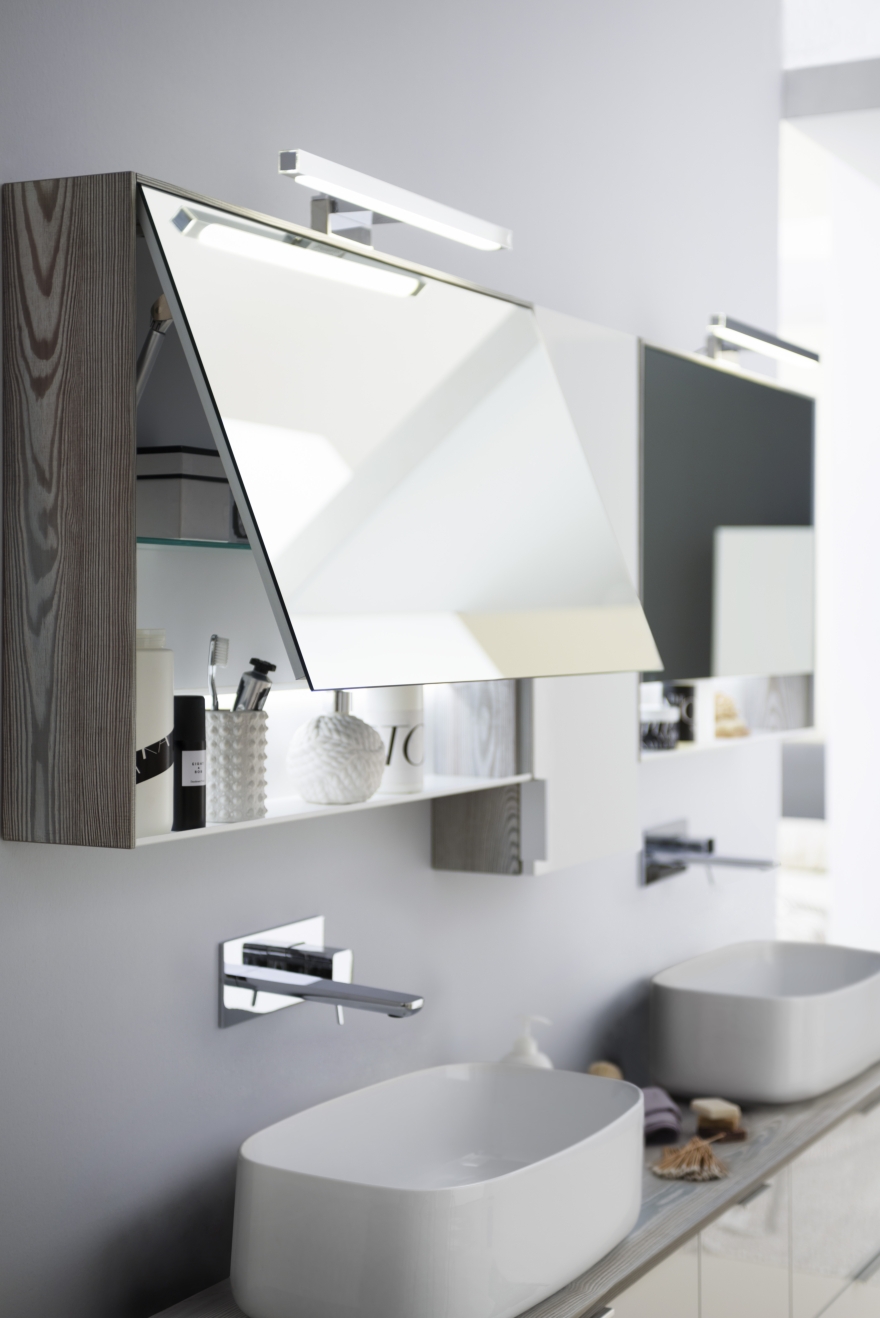La collezione è composta da mobili, colonne e specchiere ed è completata dal vassoio a giorno che diventa parte integrante sia del mobile sia della colonna e, grazie all’unione di pieno e vuoto, crea un dinamico susseguirsi di volumi che cambiano la percezione dello spazio effettivo lasciando intatta la capacità contenitiva.