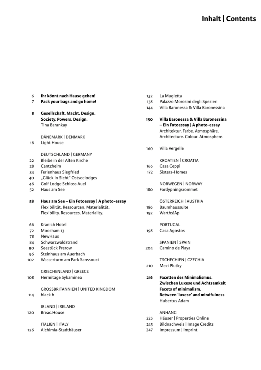 Che si tratti di una tenuta di campagna, di una capanna, di una chiesa o di una torre d’acqua: proprietari e architetti hanno realizzato qui i loro sogni personali attraverso un approccio individuale e coerente, che ci mettono a disposizione per il periodo delle vacanze. Dal casual al lusso – queste case dimostrano: architecture matters!