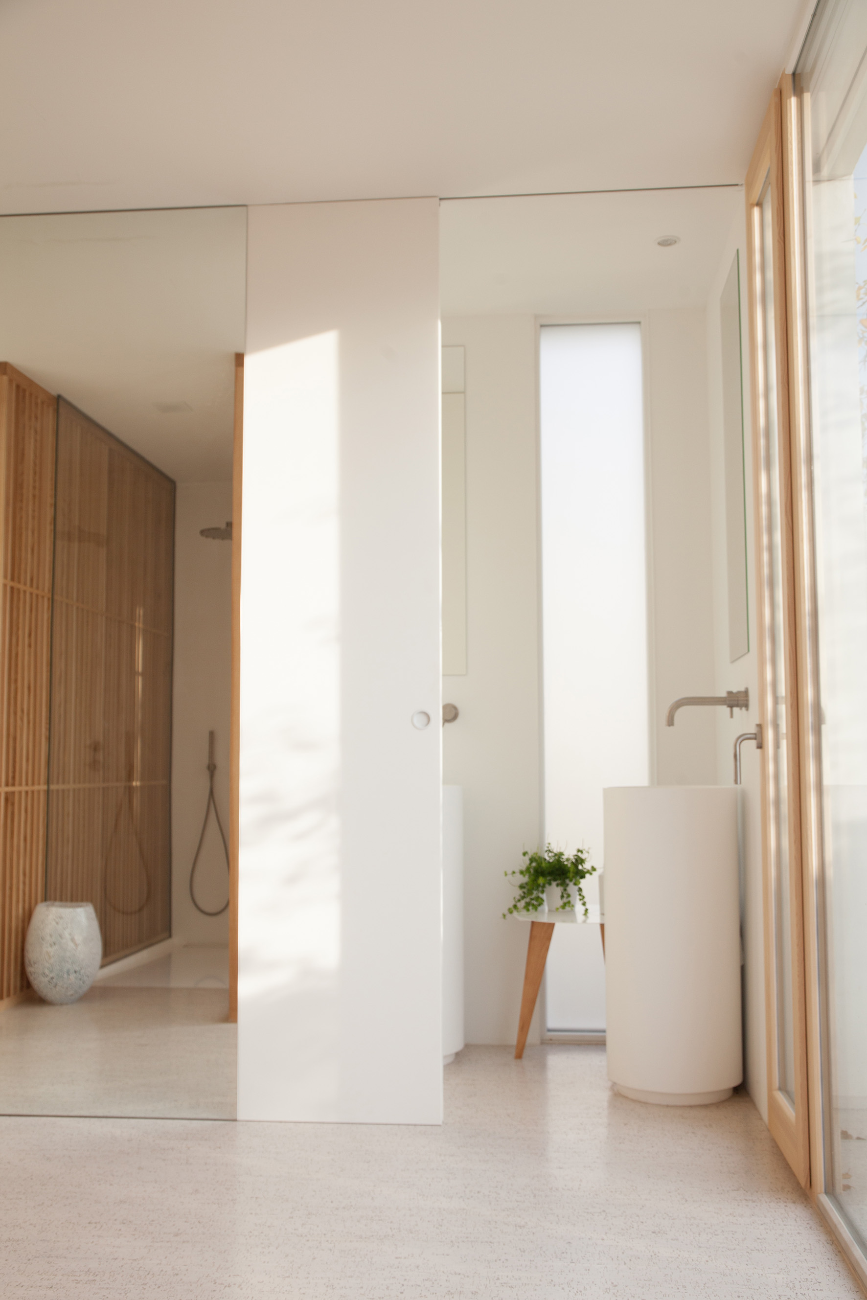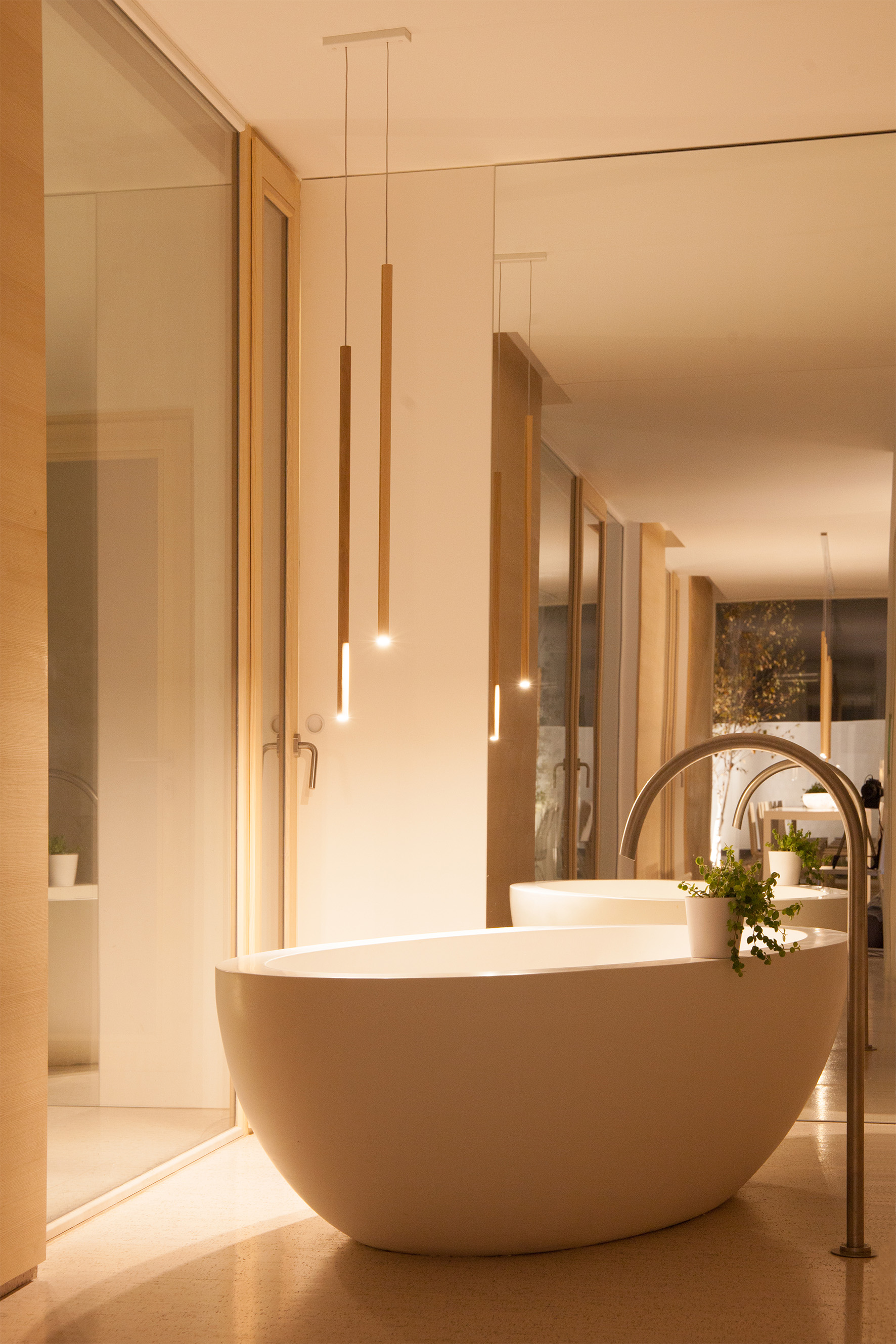 La natura è protagonista anche degli interni; la luce sfiora delicatamente le forme passando attraverso gli spazi dominati dal colore bianco e integra tutti gli elementi in legno. In questo contesto i rubinetti Mina in acciaio inossidabile sottolineano la semplicità e la purezza delle forme.