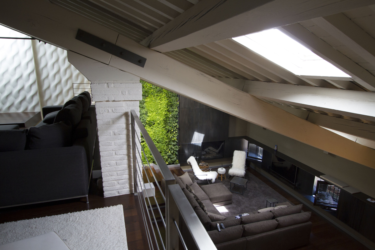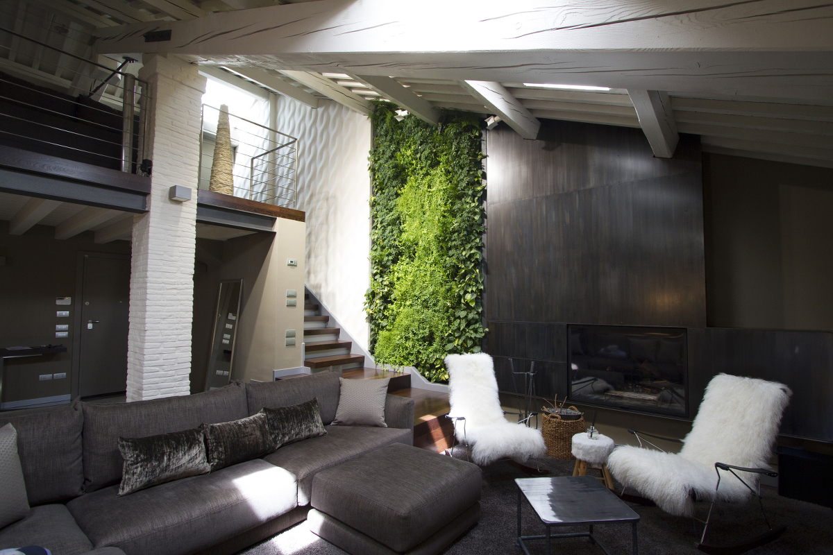 Questa caratteristica è ulteriormente sottolineata dal giardino verticale di Sundar Italia che, dalla zona living, si innalza fino al soppalco, seguendo, nella parte superiore, l’andamento della falda in legno del tetto. Visibile da tutto il loft, arreda e dà calore, spiccando per dimensione (12mq) e per l’alternarsi di nuances di verde chiaro e scuro che illuminano e ravvivano gli spazi.