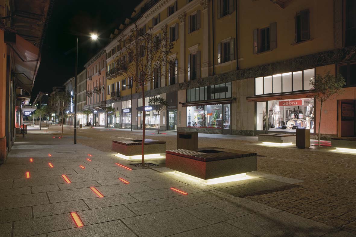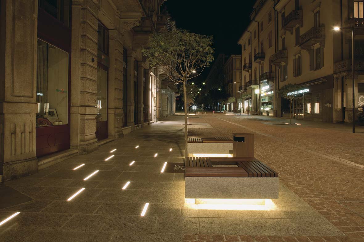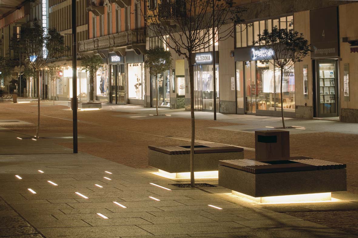 Il nuovo format illuminotecnico ha voluto evidenziare quelli che sono i focus principali della zona, ovvero i 215 metri di strada, le 20 panchine, il marciapiede nella zona delle panchine e gli alberi, 26 esemplari di tiglio. Per le panchine è stato scelto un apparecchio lineare modulabile in tecnologia LED: la sua posizione sotto la seduta creaun originale effetto di “galleggiamento”.