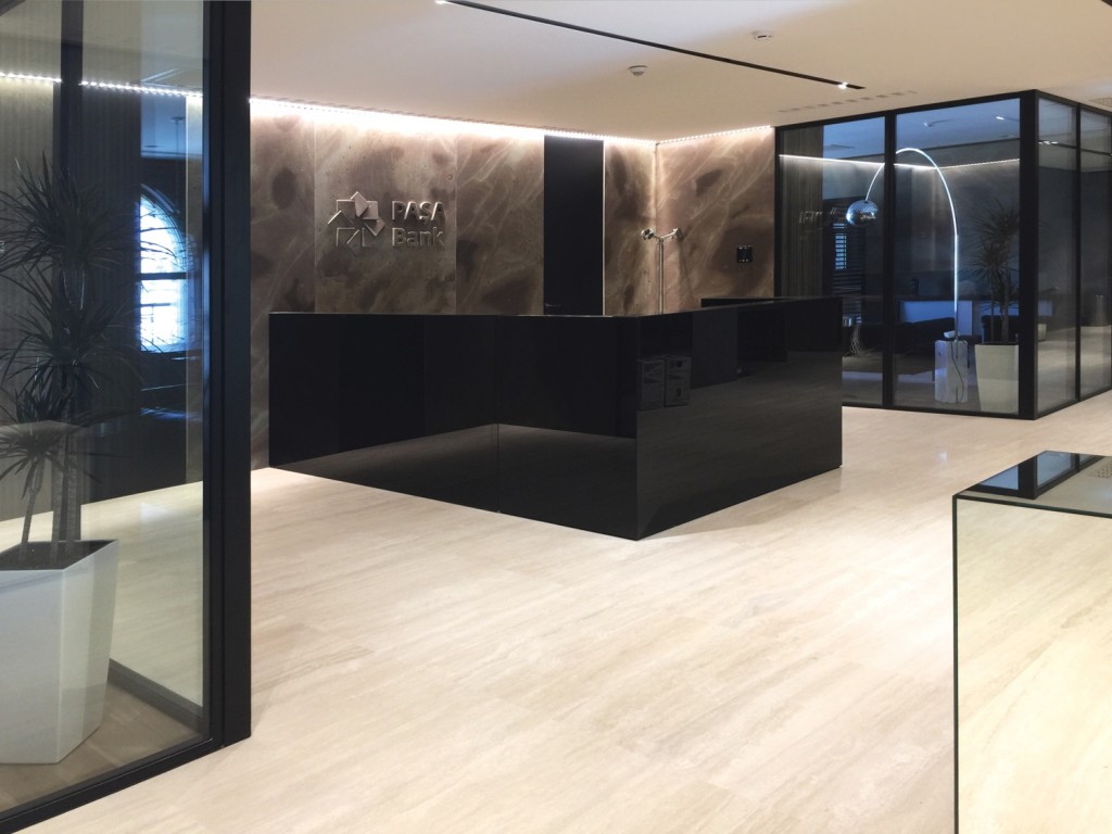 Per i locali di Pasha Bank sono state progettate, prodotte e installate delle pareti divisorie in vetro per ufficio che hanno richiesto una particolare cura nelle finiture e nella personalizzazione. Per fare ciò è stata utilizzata la serigrafia a disegno impiegando la tecnica della stampa digitale su vetro.