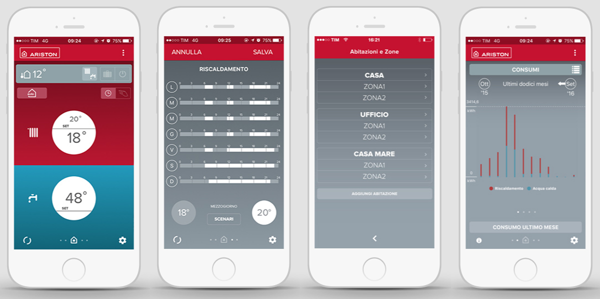 Tutto in sinergia con l’applicazione Ariston Net, disponibile sia per sistemi iOS che Android, vero cuore del sistema, tramite la quale saremo in grado di controllare dallo smartphone non solo la nostra abitazione principale, ma anche una seconda o più abitazioni. Saremo in grado di gestire tutte le impostazioni principali delle caldaie riducendo al minimo gli sprechi, ma allo stesso tempo potremo trovare la casa calda al nostro arrivo. L’app consente di: impostare un programma giornaliero e settimanale di riscaldamento, di tenere sotto controllo i consumi attraverso delle apposite schermate, di avere sempre a disposizione lo storico delle attività e di verificare le prestazioni energetiche dell’impianto solare laddove sia presente.