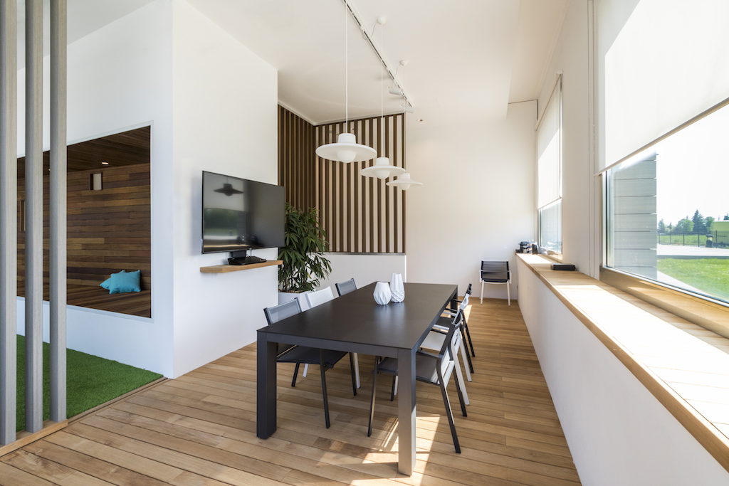 La sala riunioni è contigua all’area espositiva, entrambe affacciate sul giardino antistante l’azienda. Qui è possibile toccare con mano gli arredi e i legni naturali e compositi nelle varie finiture: UltraShield®, Décowood, Ipe Lapacho, Teak.