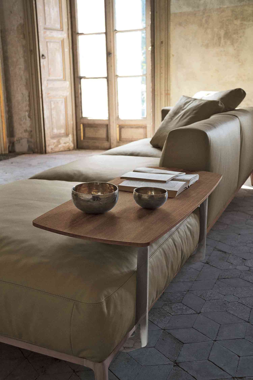 Swing ha forme morbide e accoglienti che garantiscono un altissimo grado di comfort. Si può inoltre dotare di un piano d’appoggio multifunzionale: un tavolino di servizio (disponibile in due diverse dimensioni) realizzato con gambe in acciaio cromato o nickel nero e con una superficie in rovere termo-trattato o MDF laccato opaco o lucido.