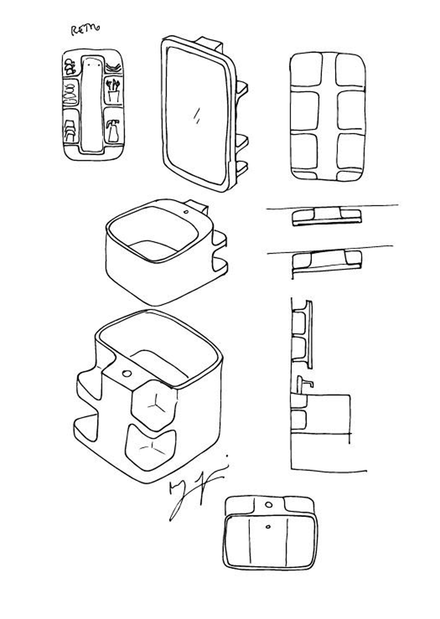 Originale anche l’abbinamento con una serie di accessori tra cui lo specchio concepito con lo stesso sistema di mensole sul retro della struttura ceramica.
