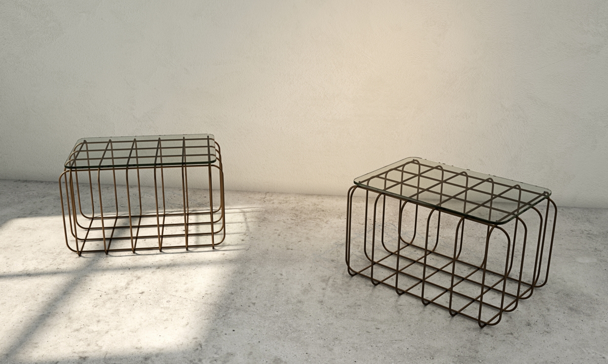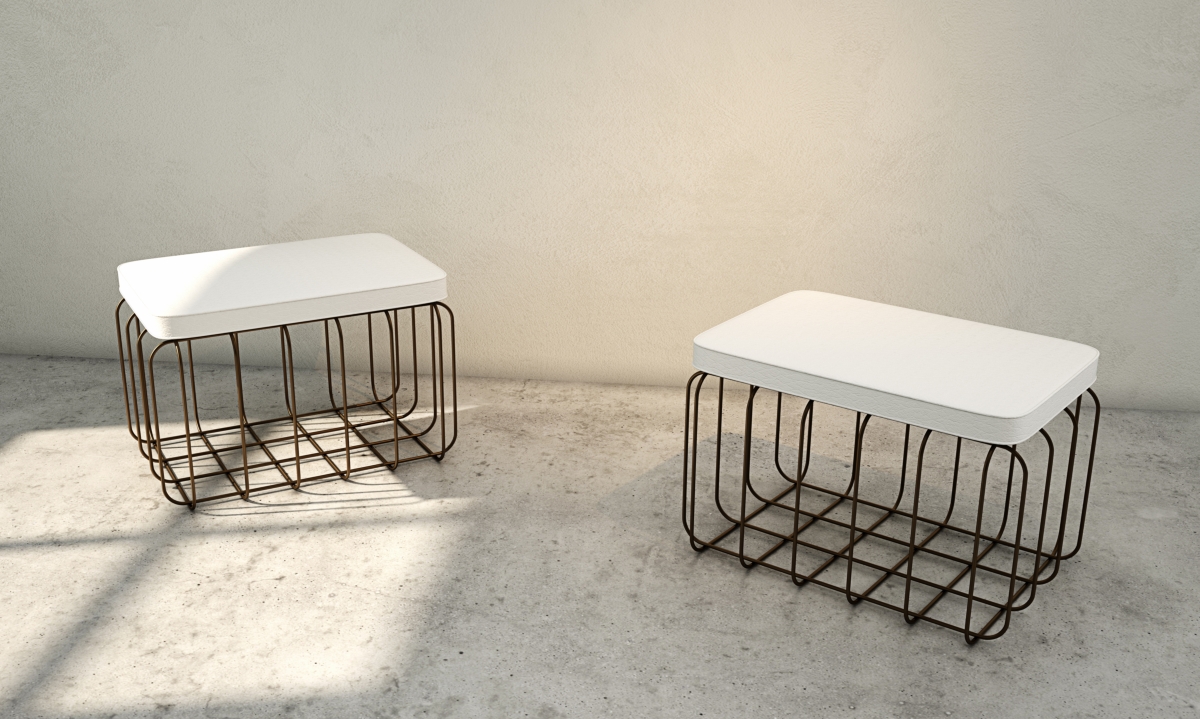 In anteprima alcuni pezzi della collezione, tra cui una libreria, un tavolino e un pouf.