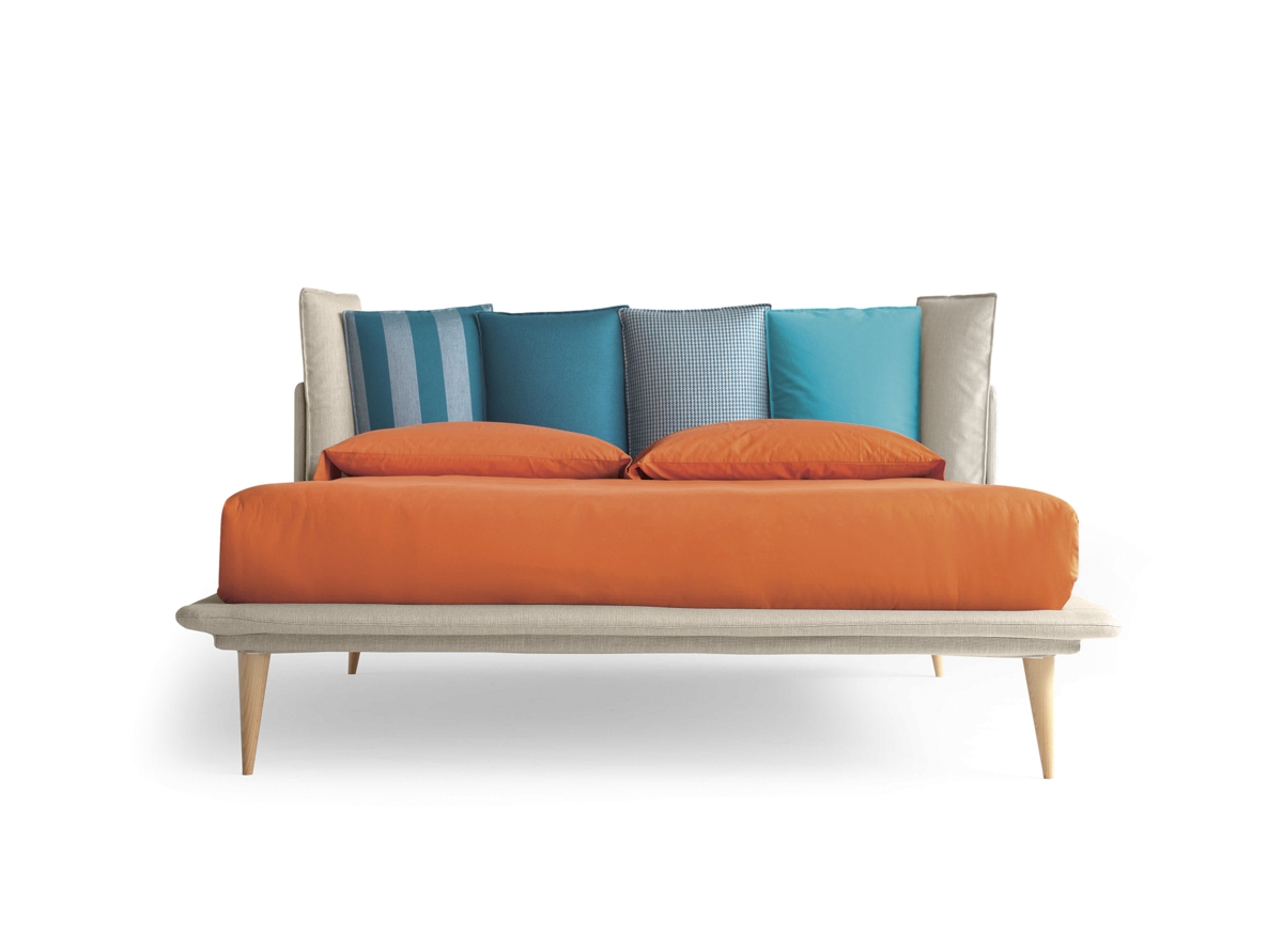 Birdland cm 160 a rete fissa proposto con struttura in tessuto Rimini 401 cat. B e testata nell’abbinamento speciale Inspiration n°6 con cuscini rivestiti in tessuto cat. B: Bellaria 700, Cervia 700, Riccione 700, Maratea 700 e Brando 22. Piedi natural obliquo h 25 cm.