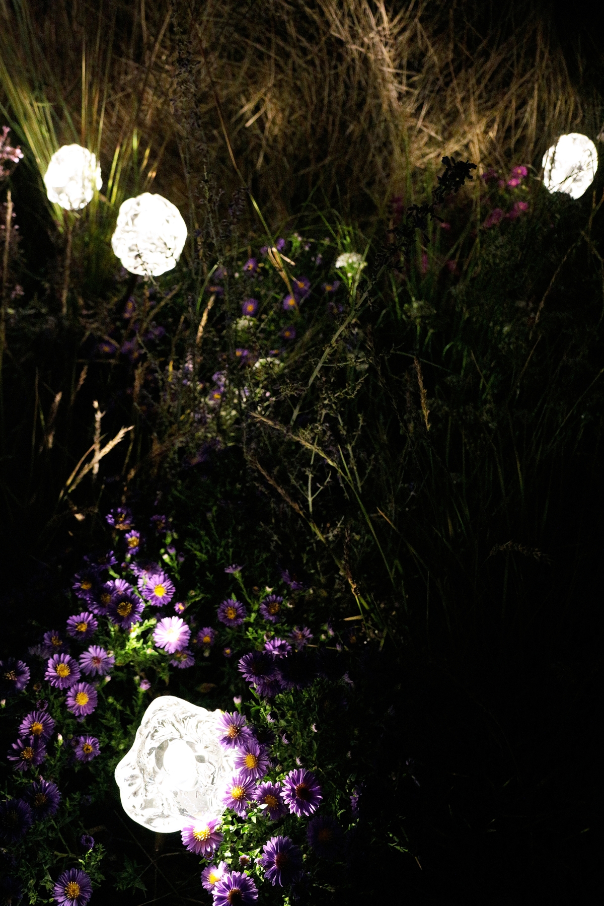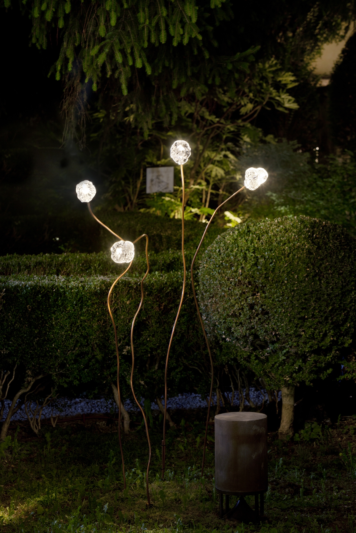 Gocce di luce, sempre in vetro industriale modellato manualmente, completano la collezione. Sostenute da aste in rame ossidato, sembrano nascere magicamente dall’ambiente esterno che le circonda.