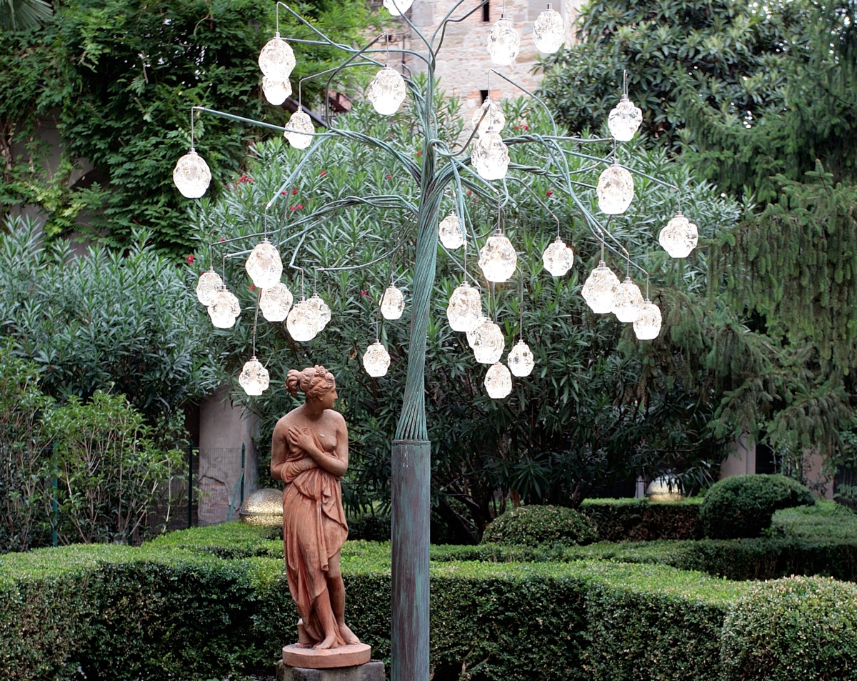 Le Gocce di Luce con un soffio di vento si spostano, oscillano e possono diventare poi i frutti di un albero, un pezzo unico realizzato da Enzo Catellani nel 2005, il cui tronco in rame dalle varie sfumature di colori, ci riporta a una magica natura del passato.