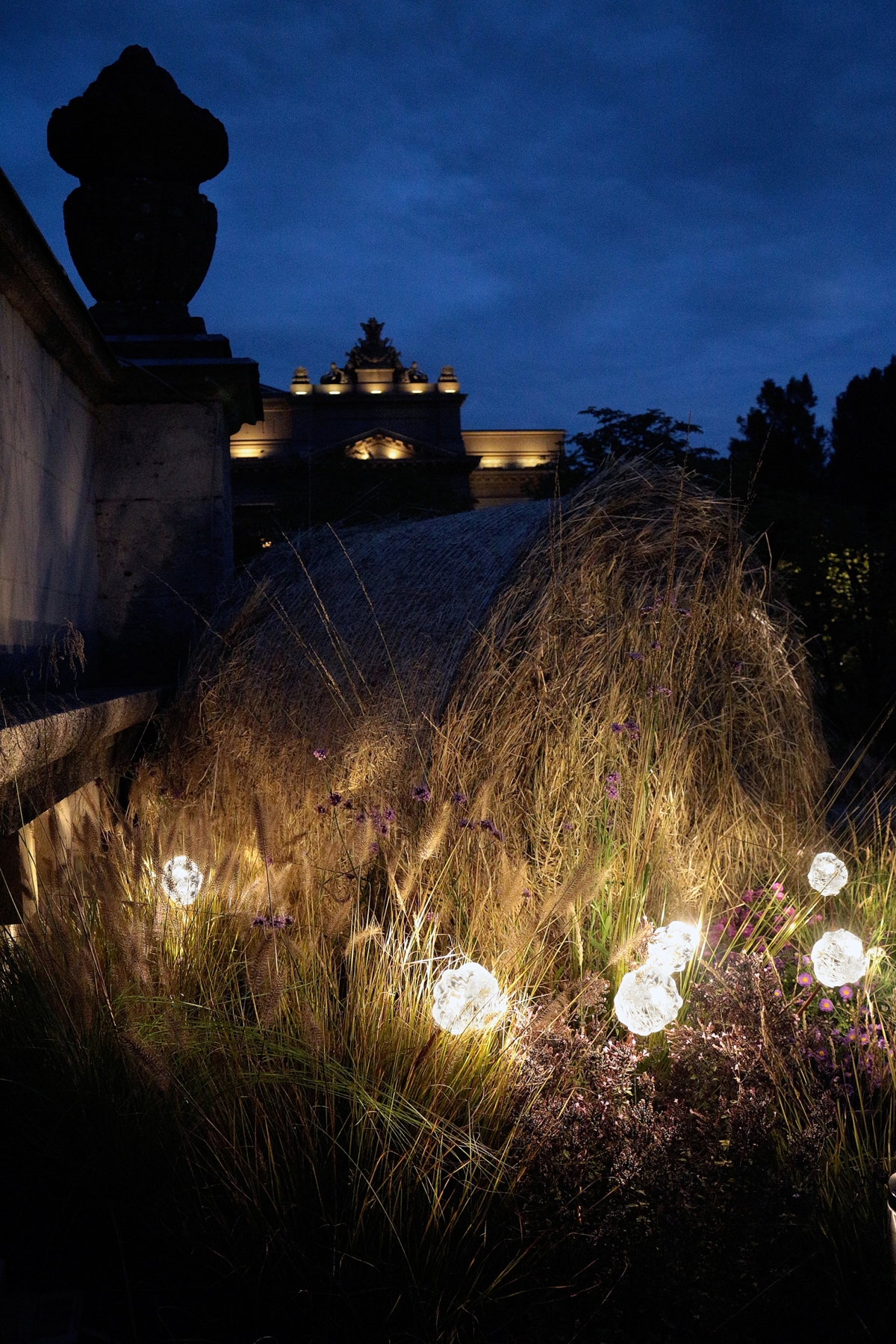 La creazione di maggiore effetto della collezione è Medousê, con un corpo composto da due coppe di vetro sovrapposte e che, mentre da spenta è di colore verde, per integrarsi perfettamente nel paesaggio, accesa diventa di un bianco etereo.