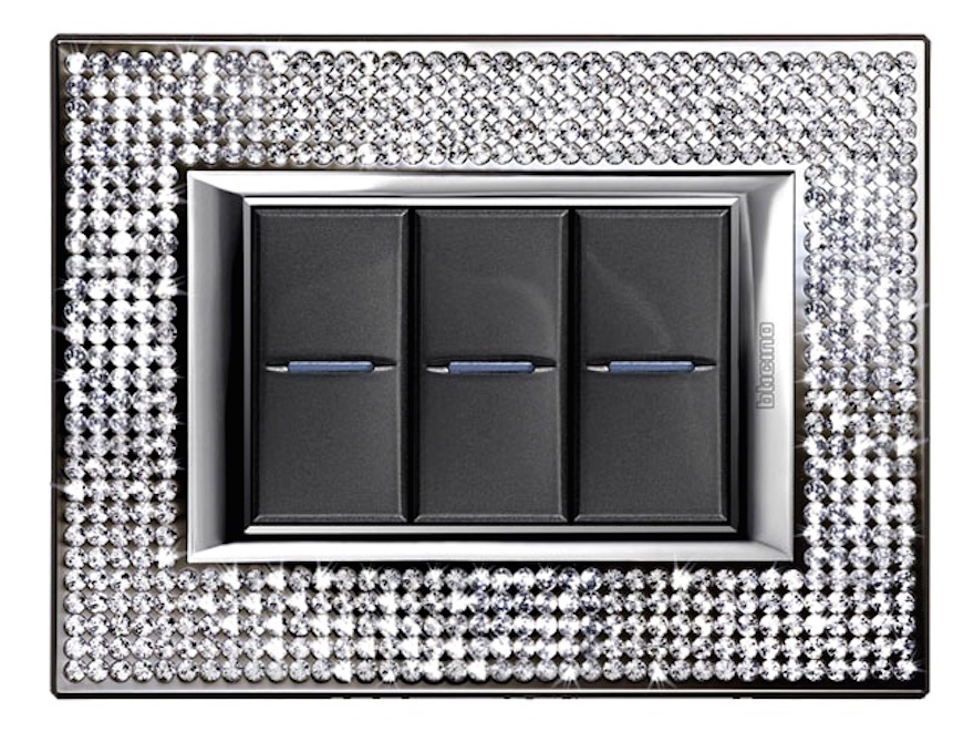 Per rendere speciale la placca accendi-luce sono stati proposti modelli incastonati con 560 cristalli Swarovski. C’è la placca con base in cromo lucido e cristalli in tonalità Crystal effetto pavè e quella con base in titanio e cristalli più piccoli nei toni caldi Light Peach, per un effetto più elegante e discreto.